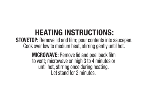 Heating instructions. Stovetop - From Chilled **Heating Instructions: Remove lid and film, pour contents into saucepan. Cook over low to medium heat, stirring gently until hot. (165 degrees) **Microwave - From Chilled **Heating Instructions: Remove lid and peel back film to vent, microwave on high 6 to 7 minutes or until hot (165 degrees), stirring once during heating. **Use caution when handling hot cup.