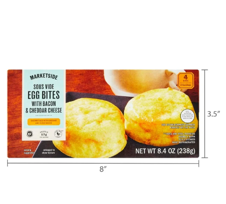 Introducing Marketside Sous Vide Egg Bites With Bacon and Cheddar Cheese! We combine creamy eggs with cheddar and cured bacon then cook Sous Vide Style to fluffy perfection. Our Sous Vide Egg Bites are redefining convenience and taste. Perfectly cooked fluffy eggs infused with bacon and cheddar without the hassle of preparation and a kitchen mess. These egg bites are made from cage free eggs, are cetified gluten free, and have 17g of Protein Per Serving. Redefining breakfast on the go, two egg bites are ready to go in under 2 minutes in the microwave. Simply heat, eat, and savor the fluffy, velvety texture and rich taste that only Marketside Sous Vide Egg Bites can provide. The perfect breakfast or protein fix anytime on the go!