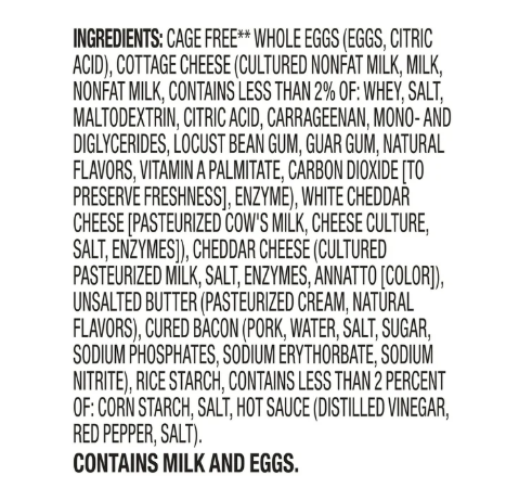 Cage-Free* Whole Eggs (eggs, citric acid), Cottage Cheese (cultured nonfat milk, milk, nonfat milk, contains less than 2% of: whey, salt, maltodextrin, citric acid, carrageenan, mono and diglycerides, locust bean gum, guar gum, natural flavors, vitamin A palmitate, carbon dioxide (to preserve freshness), enzyme), White Cheddar Cheese (pasteurized cow's milk, cheese culture, salt, enzymes), and powdered cellulose (anti-caking agent)), Cheddar Cheese (cheddar cheese (cultured pasteurized milk, salt, enzymes, annatto (color)), potato starch (anti-caking agents)), Unsalted Butter (pasteurized cream, natural flavors), Cured Bacon (pork - cured with water, salt, sugar, sodium phosphates, sodium erythorbate, sodium nitrite), Rice Starch, Corn Starch, Salt, Hot Sauce (distilled vinegar, red pepper, salt). *Hens are free roaming inside the barn.