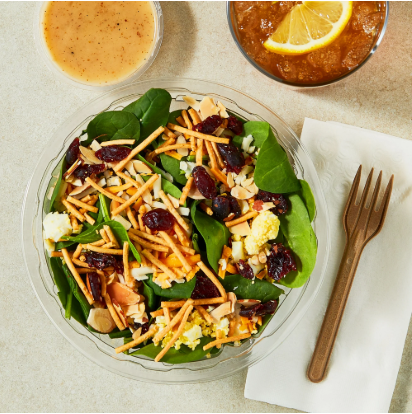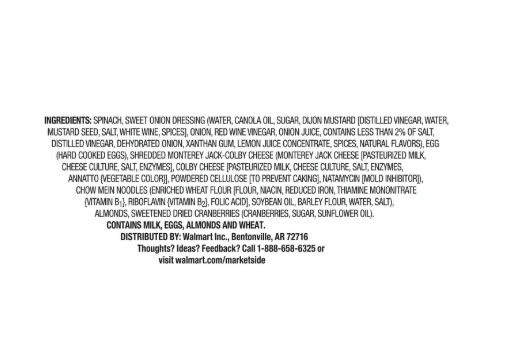 Spinach, Sweet Onion Dijon Vinaigrette (Water, Vegetable Oil [Canola and/or Soybean Oil], Sugar, Dijon Mustard [Distilled Vinegar, Water, Mustard Seed, Salt, White Wine, Citric Acid, Turmeric, Tartaric Acid, Spices], Onion, Sweet Onion [Sweet Onion, Vinegar, Salt], White Wine Vinegar, Less than 2% of Salt, Lemon Juice Concentrate, Dried Onion, Spices, Xanthan Gum, Natural Flavor), Hard Cooked Eggs, Monterey Jack & Colby Cheese Blend (Monterey Jack Cheese [Pasteurized Milk, Cheese Culture, Salt, Enzymes], Colby Cheese [Pasteurized Milk, Cheese Culture, Salt, Enzymes, Annatto {Vegetable Color}], Powdered Cellulose [to Prevent Caking], Natamycin [a Mold Inhibitor]), Chow Mein Noodles (Enriched Wheat Flour [Wheat Flour, Niacin, Reduced Iron, Thiamine Mononitrate {Vitamin B1} Riboflavin {Vitamin B2), Folic Acid], Non-GMO Soybean Oil, Barley Flour, Water, Salt), Almonds, Sweetened Dried Cranberries (Cranberries, Sugar, Sunflower Oil).