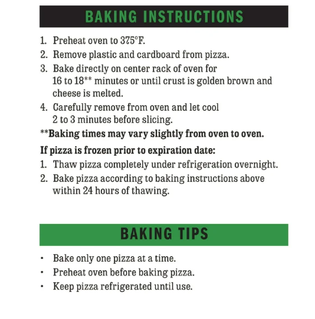 Baking Instructions: 1. Preheat oven to 375°F. 2. Remove plastic and cardboard from pizza. 3. Bake directly on center rack of oven for 14 to 16 minutes or until crust is golden brown and cheese is melted. 4. Carefully remove from oven and let cool 2 to 3 minutes before slicing. *Baking times may vary slightly from oven to oven. If pizza is frozen prior to expiration date: 1. Thaw pizza completely under refrigeration overnight. 2. Bake pizza according to baking instructions above within 24 hours of thawing. Baking Tips: • Bake only one pizza at a time. • Preheat oven before baking pizza. • Keep pizza refrigerated until use.