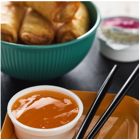 Asian-inspired sauce that is semi-translucent with notes of pineapple and a bell pepper finish