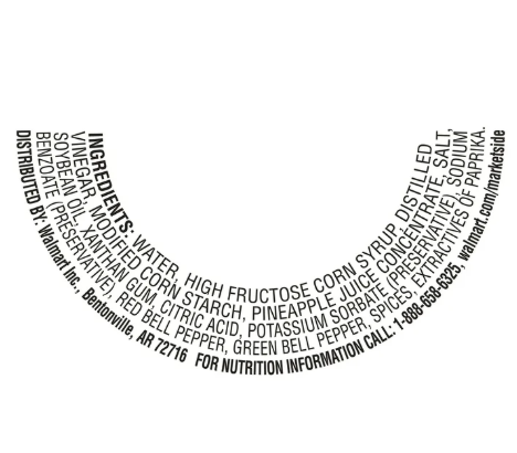 Water, high fructose corn syrup, distilled vinegar, modified corn starch, pineapple juice concentrate, salt, soybean oil, xanthan gum, citric acid, potassium sorbate (preservative), sodium benzoate (preservative), red bell pepper, green bell pepper, spices, extractives of paprika.