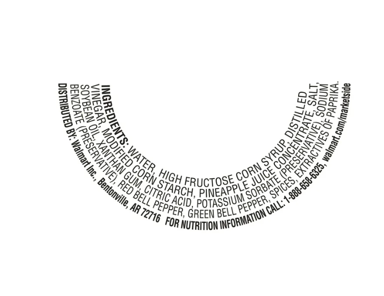 Water, high fructose corn syrup, distilled vinegar, modified corn starch, pineapple juice concentrate, salt, soybean oil, xanthan gum, citric acid, potassium sorbate (preservative), sodium benzoate (preservative), red bell pepper, green bell pepper, spices, extractives of paprika.