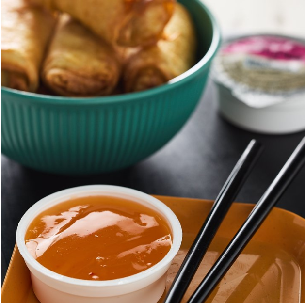 Asian-inspired sauce that is semi-translucent with notes of pineapple and a bell pepper finish