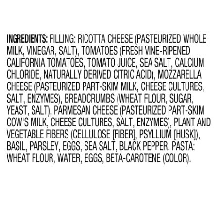 Ricotta cheese (pasteurized whole milk, vinegar, salt), tomatoes (fresh vine-ripened california tomatoes, tomato juice, sea salt, calcium chloride, naturally derived citric acid), mozzarella cheese (pasteurized part skim milk, cheese cultures, salt, enzymes), breadcrumbs (wheat flour, sugar, yeast, salt), parmesan cheese (pasteurized part-skim cow’s milk, cheese cultures, salt, enzymes), plant and vegetable fibers (cellulose [fiber], psyllium [husk]), basil, parsley, eggs, sea salt, black pepper. PASTA: Wheat flour, water, eggs, beta-carotene (color).