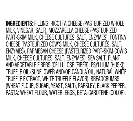Ricotta cheese (pasteurized whole milk, vinegar, salt), mozzarella cheese (pasteurized part skim milk, cheese cultures, salt, enzymes), fontina cheese (pasteurized cow’s milk, cheese cultures, salt enzymes), parmesan cheese (pasteurized part-skim cow’s milk, cheese cultures, salt, enzymes), sea salt, plant and vegetable fibers (cellulose [fiber], psyllium [husk]), truffle oil (canola oil, natural white truffle extract, white truffle flavor), breadcrumbs (wheat flour, sugar, yeast, salt), parsley, black pepper. PASTA: Wheat flour, water, eggs, beta-carotene (color).