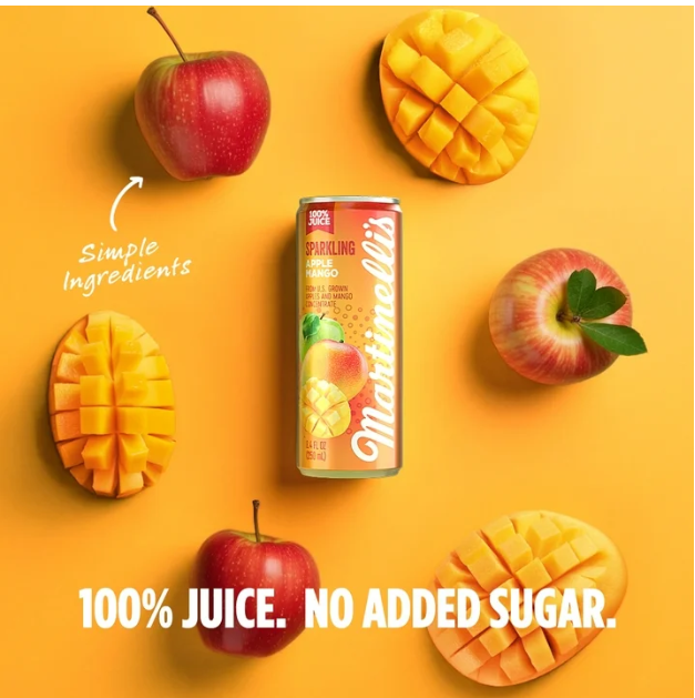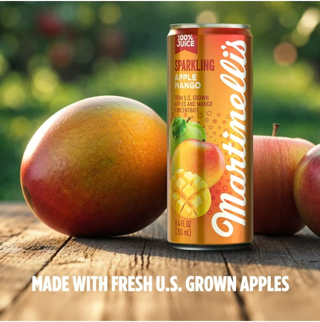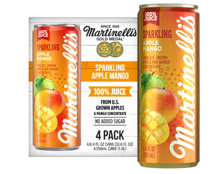 Martinelli's 100% fresh-pressed apple juice is made from U.S.-grown fresh apples with mango juice added for a crisp and refreshing taste. Our product contains no added sugars and is non-alcoholic, so everyone in the family can enjoy it! Martinelli Sparkling Juice is available in a convenient 4-pack.