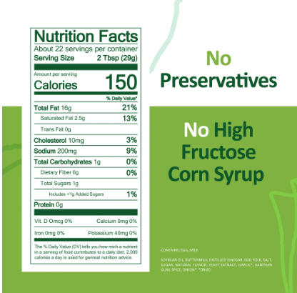 Soybean Oil, Buttermilk, Distilled Vinegar, Egg Yolk, Salt, Sugar, Natural Flavor, Yeast Extract, Garlic*, Xanthan Gum, Spice, Onion*. * Dried.