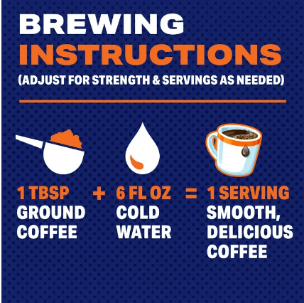 BREWING INSTRUCTIONS1 TBSP COFFEE+6 FL OZ WATER=1 SERVING.ADJUST FOR STRENGTH AND SERVINGS AS NEEDED.WE RECOMMEND USING THE DIRECTIONS ABOVE AND FRESH, COLD WATER.FOR MAXIMUM FRESHNESS, STORE IN A SEALED CONTAINER IN A COOL, DARK, AND DRY PLACE.