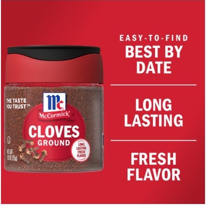 McCormick No Artificial Flavors Kosher Ground Cloves, 0.9 oz Bottle. Cloves are the dried flower buds of a tropical evergreen tree native to Southeast Asia. At McCormick we hand-select the whole cloves before drying and grinding them. Our Ground Cloves bring an intense, warm flavor to spice cakes and cookies, as well as glazed ham.Ground cloves are an essential part of your spice collection, especially when baking for the holidays. Sweet and aromatic cloves add festive flavor to gingerbread cookies, pumpkin pie and mulled cider. Cloves' intense spiciness also work well in baked beans, BBQ sauces, dry rubs and pot roast. In India where cloves are prized for their fragrance, they appear in chai tea, spice blends and rice dishes. The flavor of cloves can be strong and pungent, so a pinch is often all you need. This McCormick Ground Cloves is in a Plastic bottle that is 0.9 ounces. Store this shelf-stable item at an ambient temperature.