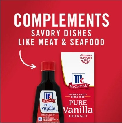 McCormick Non-GMO Gluten Free Pure Vanilla Extract, 2 fl oz Box. For a richer, sweeter bite, reach for McCormick Pure Vanilla Extract. Its strong, floral-like sweetness with hints of bourbon, rum, and dried fruit are at the heart of baking, elevating cookies, cakes, pies, quick breads, and so much more. McCormick Pure Vanilla Extract is crafted with care, ensuring consistent flavor and aroma across every bottle. No corn syrup and gluten free, you can feel good about sharing the signature vanilla flavor of this extract with your family. Stir it into pancake or waffle batter, cookie dough, cakes, or pies, or even use it to complement savory meat and seafood dishes. A stand-out flavor for holiday traditions, and the key to starting new ones, pure vanilla is an ingredient that can be enjoyed year-round. As a global leader in flavor, McCormick is proud to advance our efforts to sustainably source ingredients, starting with our ever-popular Premium Vanilla Extract! You can now find the Grown for Good seal proudly displayed on our bottles. We are proud to invest in our farmers by supporting higher incomes and resiliency for thousands of farmers, providing health insurance coverage to thousands of farming families, and the building and restoration of schools in farming communities. This McCormick Pure Vanilla Extract is in a Plastic box that is 2 fluid ounces. Store this shelf-stable item at an ambient temperature.
