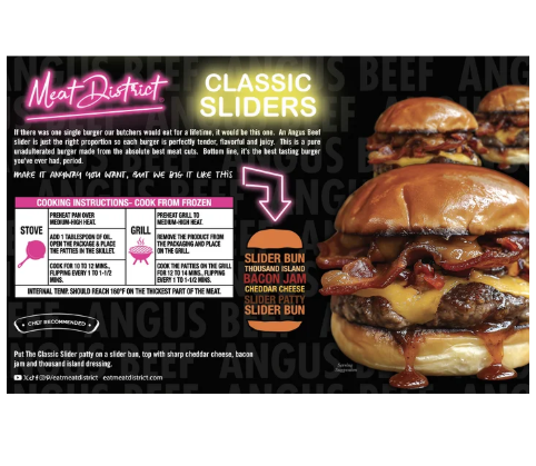 Meat District, Classic Sliders Beef Patties, 2 lbs (Frozen). These deliciously tender and juicy restaurant style ground beef patties are made with 100% Angus Beef. Each Container comes with 16, 2 lb Slider Patties that are perfect for any occasion.