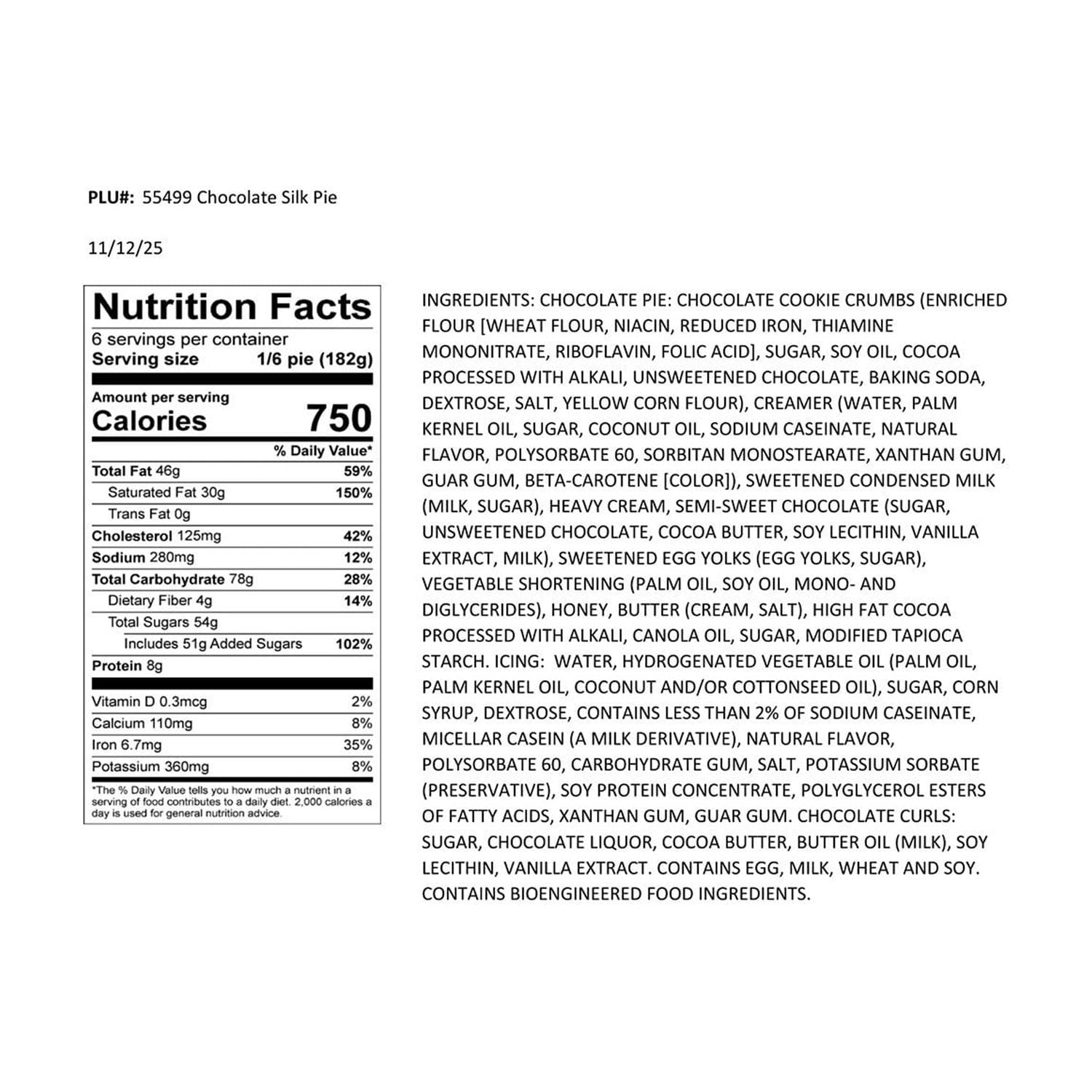 Ingredients: Cookie Crumbs (Enriched Wheat Flour [Wheat Flour, Niacin, Reduced Iron, Thiamine Mononitrate, Riboflavin, Folic Acid], Sugar, Soybean Oil, Cocoa [Processed With Alkali], Unsweetened Chocolate, Baking Soda, Dextrose, Salt, Yellow Corn Flour), Creamer (Water, Palm Kernel Oil, Sugar, Coconut Oil, Sodium Caseinate, Natural Flavor, Polysorbate 60, Sorbitan Monostearate, Xanthan Gum, Guar Gum, Beta-carotene [Color]), Sweetened Condensed Milk (Milk, Sugar), Heavy Cream, Semi-sweet Chocolate (Sugar, Unsweetened Chocolate, Cocoa Butter, Soy Lecithin, Vanilla Extract, Milk), Sweetened Egg Yolks (Egg Yolks, Sugar), Vegetable Shortening (Palm Oil, Soybean Oil, Mono- And Diglycerides), Honey, Butter (Cream, Salt), High Fat Cocoa (Processed With Alkali), Canola Oil, Sugar, Modified Tapioca Starch.