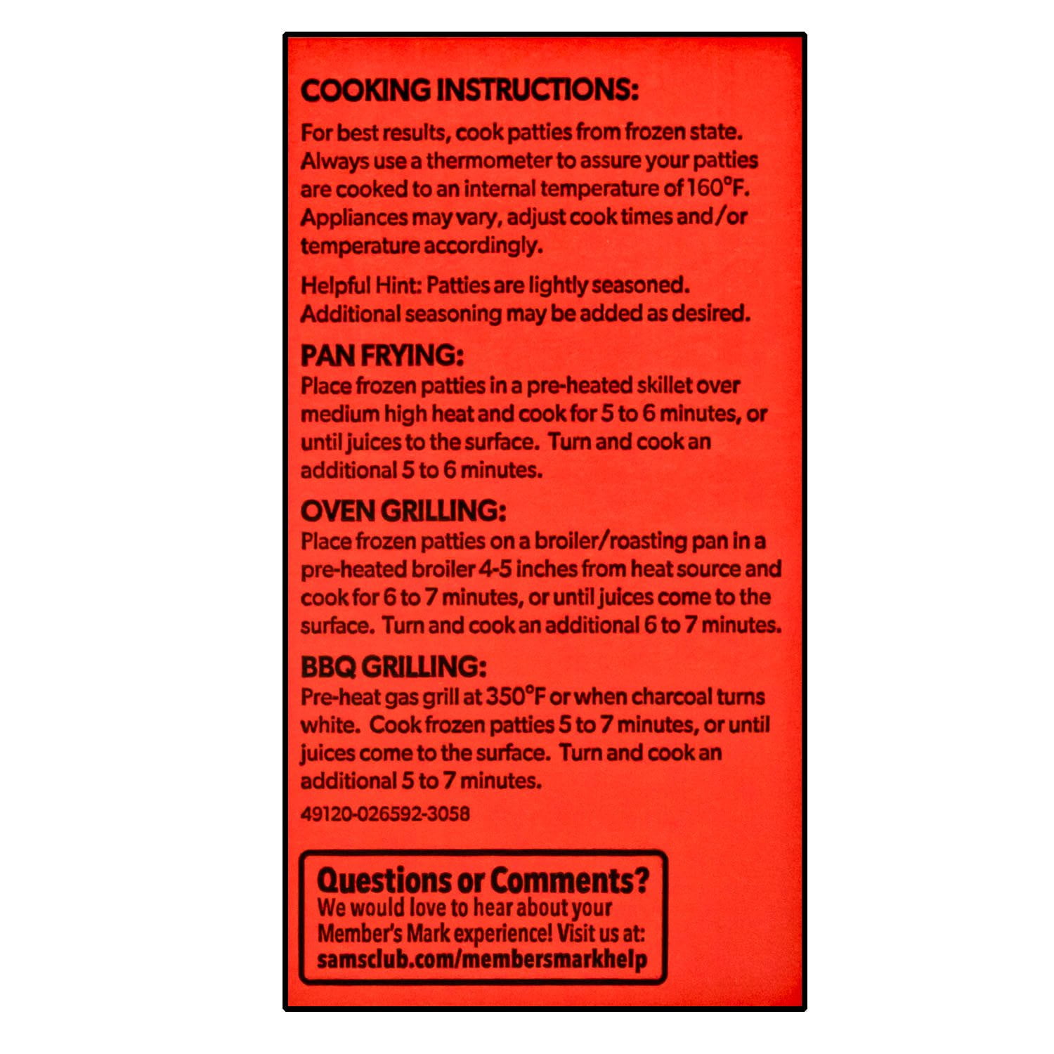 For best results, cook patties from frozen state. Always use a thermometer to assure your patties are cooked to an internal temperature of 160°F. Appliances may vary, adjust cook times and/or temperature accordingly.