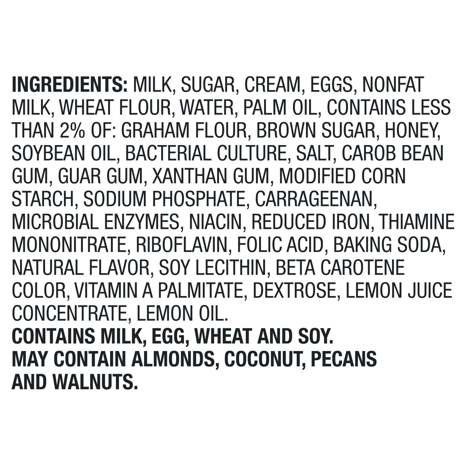 Ingredients: Cream, milk, sugar, eggs, wheat flour, less than 2% of: brown sugar, palm oil, honey, nonfat milk, graham flour, dextrose, whey, salt, cheese culture, vanilla bean extractives, lemon juice concentrate, lemon oil, natural flavor, carrageenan, water, carob bean gum, guar gum, xanthan gum, baking soda, niacin, reduced iron, thiamine mononitrate, riboflavin, folic acid, soy lecithin
