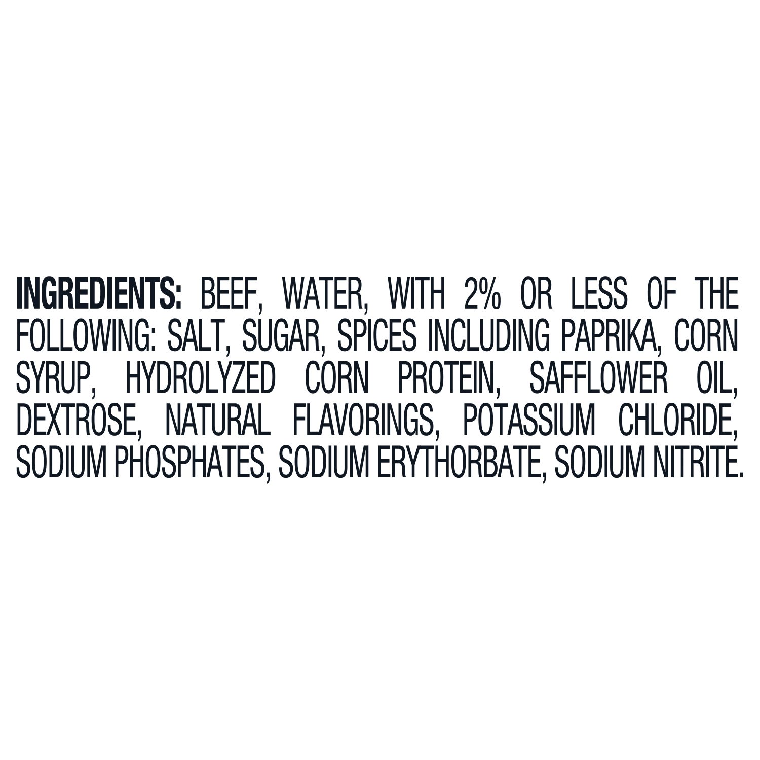 Beef, Water, Corn Syrup, With 2% Or Less Of The Following: Salt, Sugar, Spices Including Paprika, Hydrolyzed Corn Protein, Safflower Oil, Dextrose, Natural Flavorings, Potassium Chloride, Sodium Phosphates, Sodium Erythorbate, Sodium Nitrite.