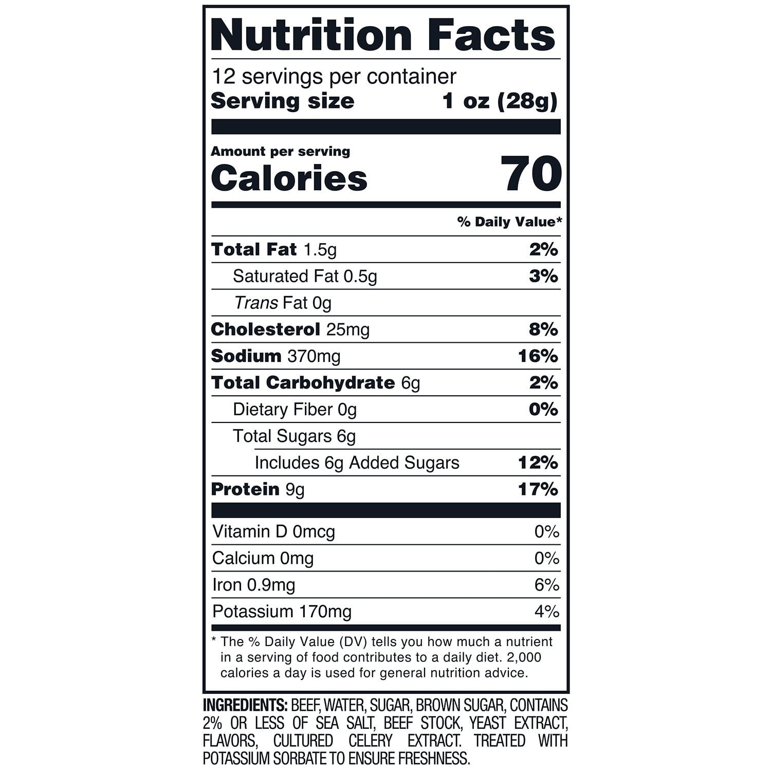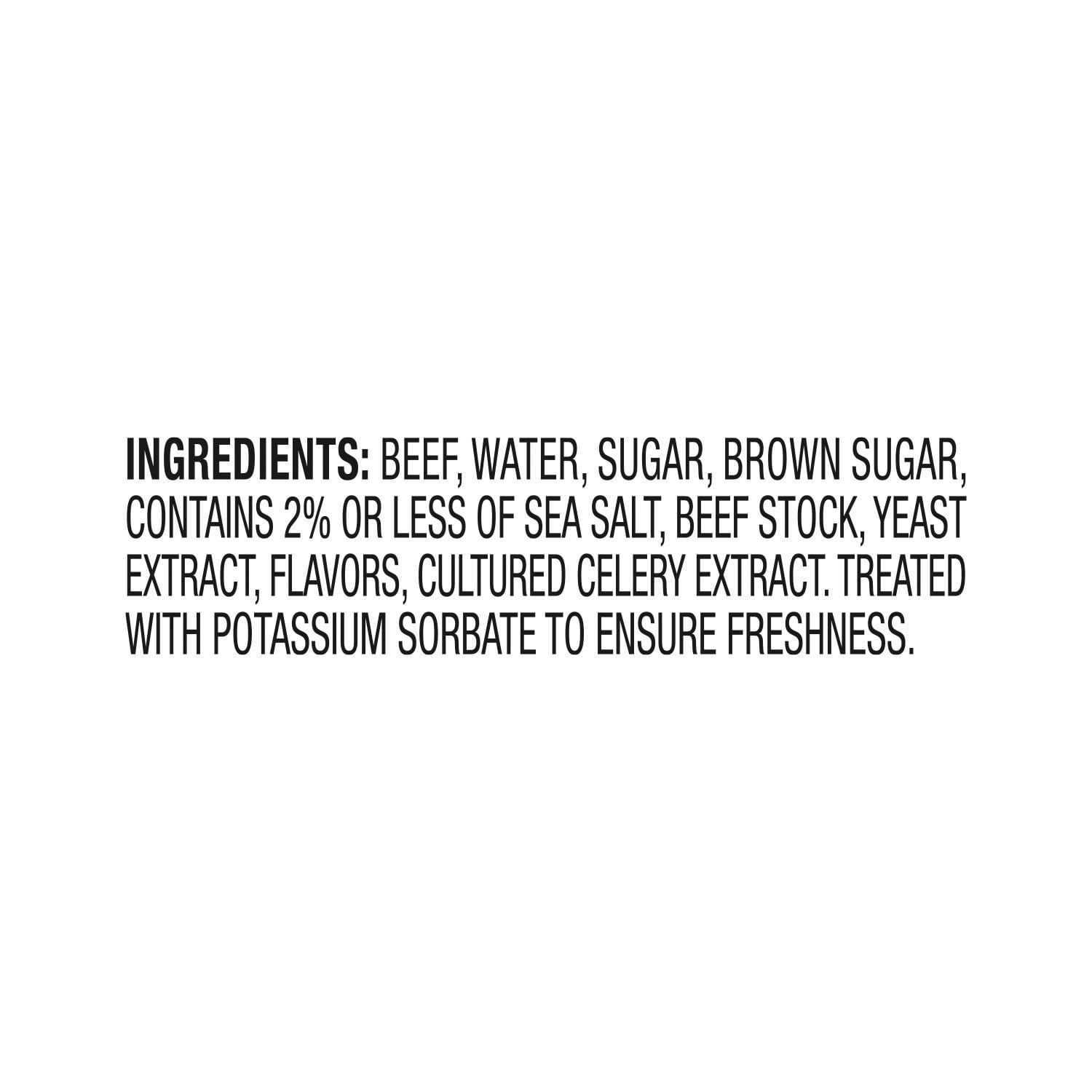 Ingredients: Beef, Water, Sugar, Brown Sugar, Contains 2% Or Less Of Sea Salt, Beef Stock, Yeast Extract, Flavors, Cultured Celery Extract. Treated With Potassium Sorbate To Ensure Freshness.