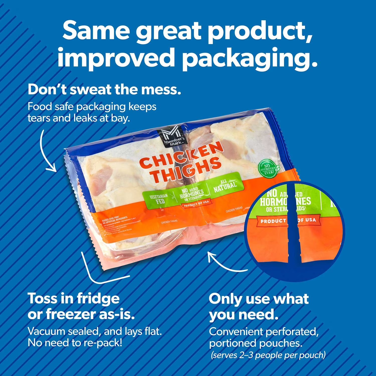 Member's Mark Bone-In Chicken Thighs, priced per pound are packaged in four separate pouches, ensuring convenient cooking and storage. Whether you're cooking for a small gathering or preparing meals ahead, these bone-in chicken thighs offer unmatched convenience.