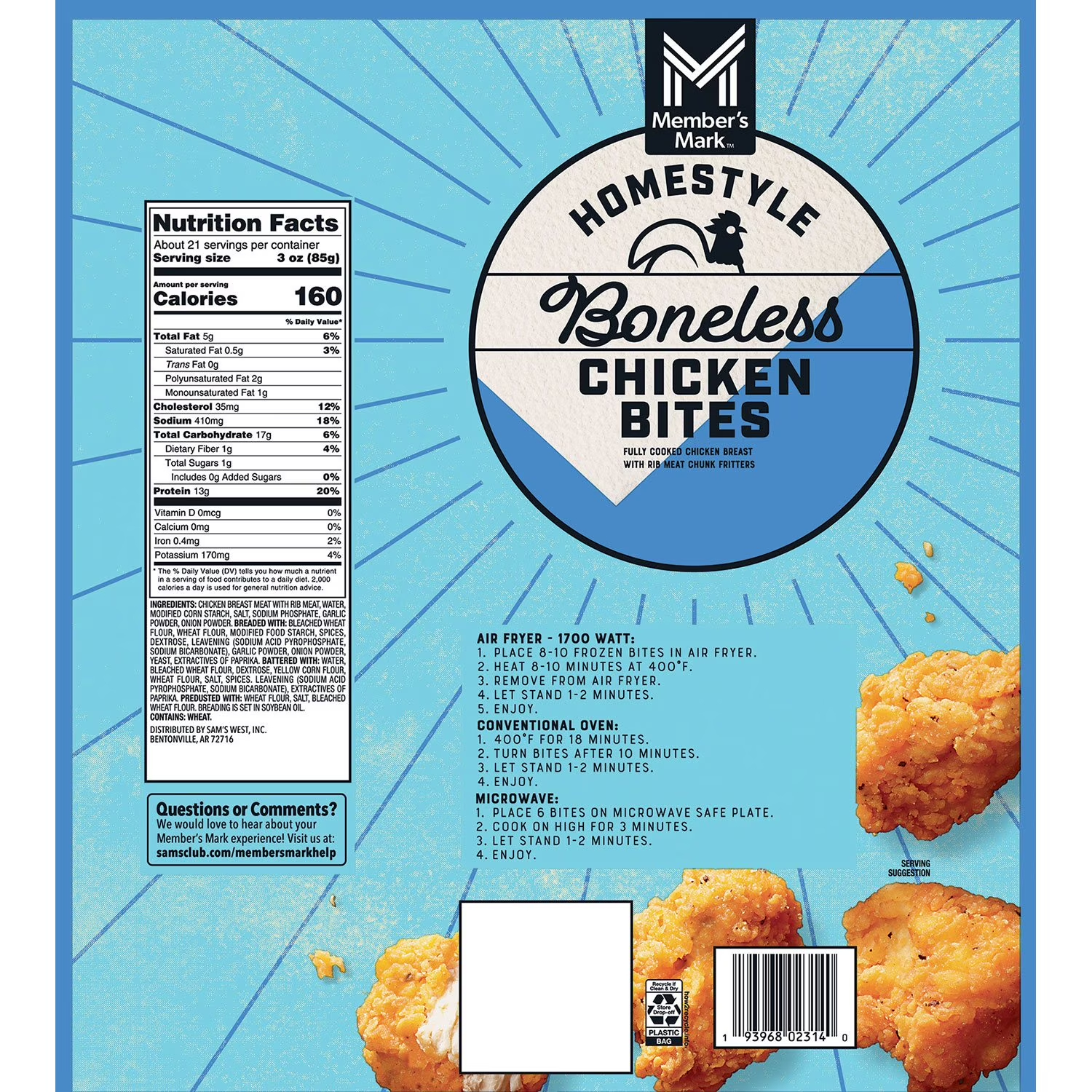 Even the pickiest of picky eaters will enjoy our Member's Mark Breaded and Boneless Homestyle Chicken Bites, Frozen, 4 lbs. Enjoy them plain or dip each chicken bite into your favorite sauce for a fun flavor combination. Our chicken bites are made with fully cooked chicken breast with rib meat chunk fritters. They’re made with all-white meat from chickens raised with No Antibiotics Ever (NAE) and contain no added hormones or steroids, so you're only getting good meat and good protein with 13g of protein per serving. Serve them with a side of ketchup, Ranch dressing or sriracha mayo but any dip works. You can also toss the prepared chicken bites in a light coating of barbecue sauce, buffalo sauce or any homemade sauce you have up your sleeve. We provide the foundation for you to impress your guests.