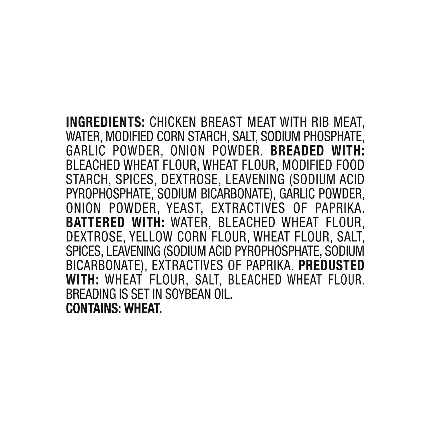 Ingredients: Chicken Breast Meat With Rib Meat, Water, Modified Corn Starch, Salt, Sodium Phosphate, Garlic Powder, Onion Powder. Breaded With: Bleached Wheat Flour, Wheat Flour, Modified Food Starch, Spices, Dextrose, Leavening (Sodium Acid Pyrophosphate, Sodium Bicarbonate), Garlic Powder, Onion Powder, Yeast, Extractives Of Paprika. Battered With: Water, Bleached Wheat Flour, Dextrose, Yellow Corn Flour, Wheat Flour, Salt, Spices, Leavening (Sodium Acid Pyrophosphate, Sodium Bicarbonate), Extractives Of Paprika. Predusted With: Wheat Flour, Salt, Bleached Wheat Flour. Breading Is Set In Soybean Oil.