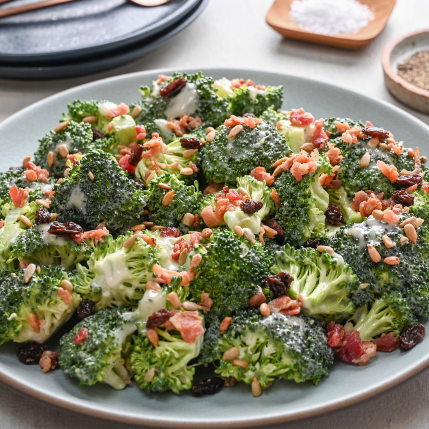 - Broccoli, smokey bacon, sweet raisins and sunflower seeds with a creamy dressing