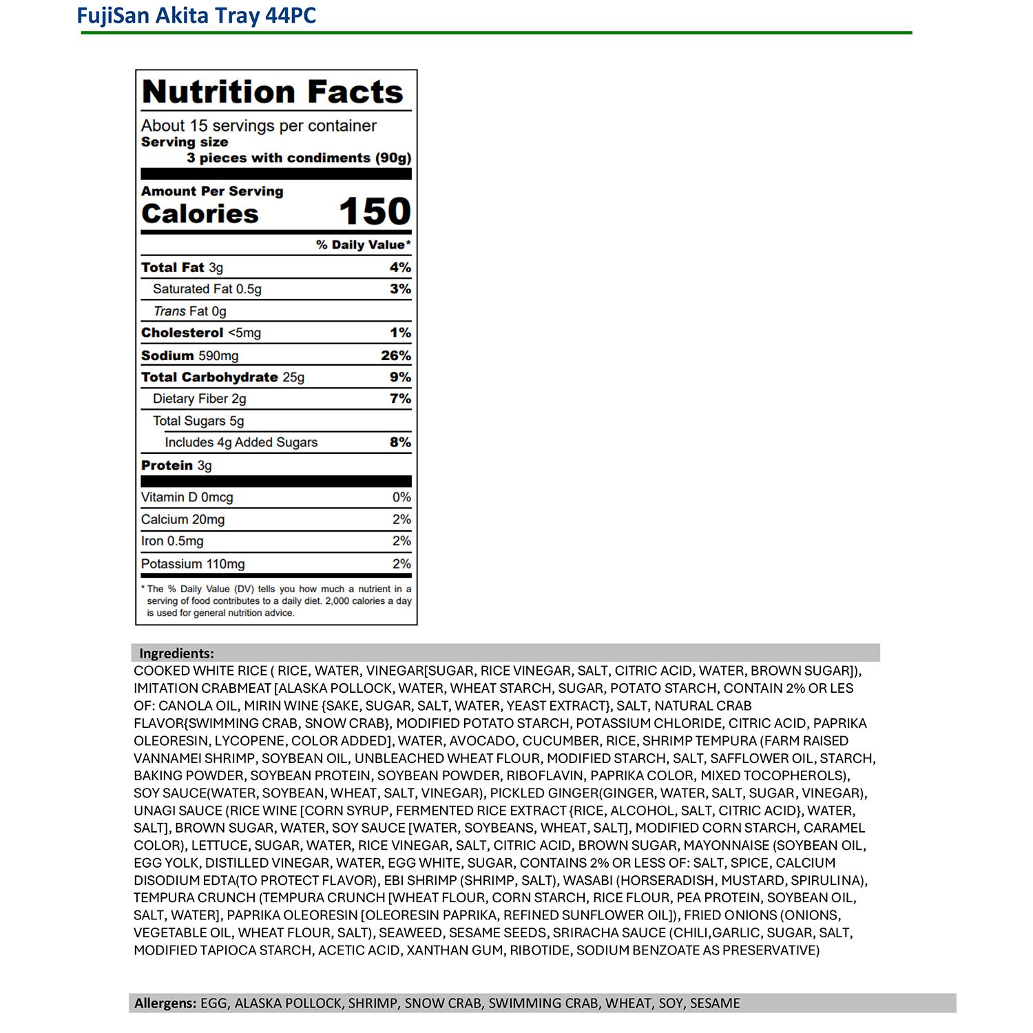 Contains: Egg, Alaska Pollock, Shrimp, Snow Crab, Swimming Crab, Wheat, Soy, Sesame