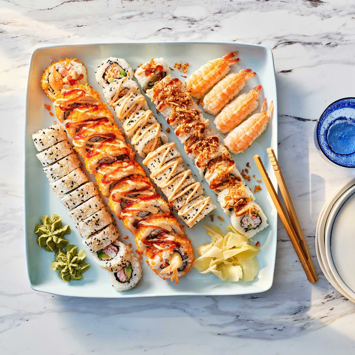 - Includes 10 pcs. each of Spicy California, California, Tempura Shrimp, California Crunch Rolls and 4 pcs. Ebi Shrimp Nigiri