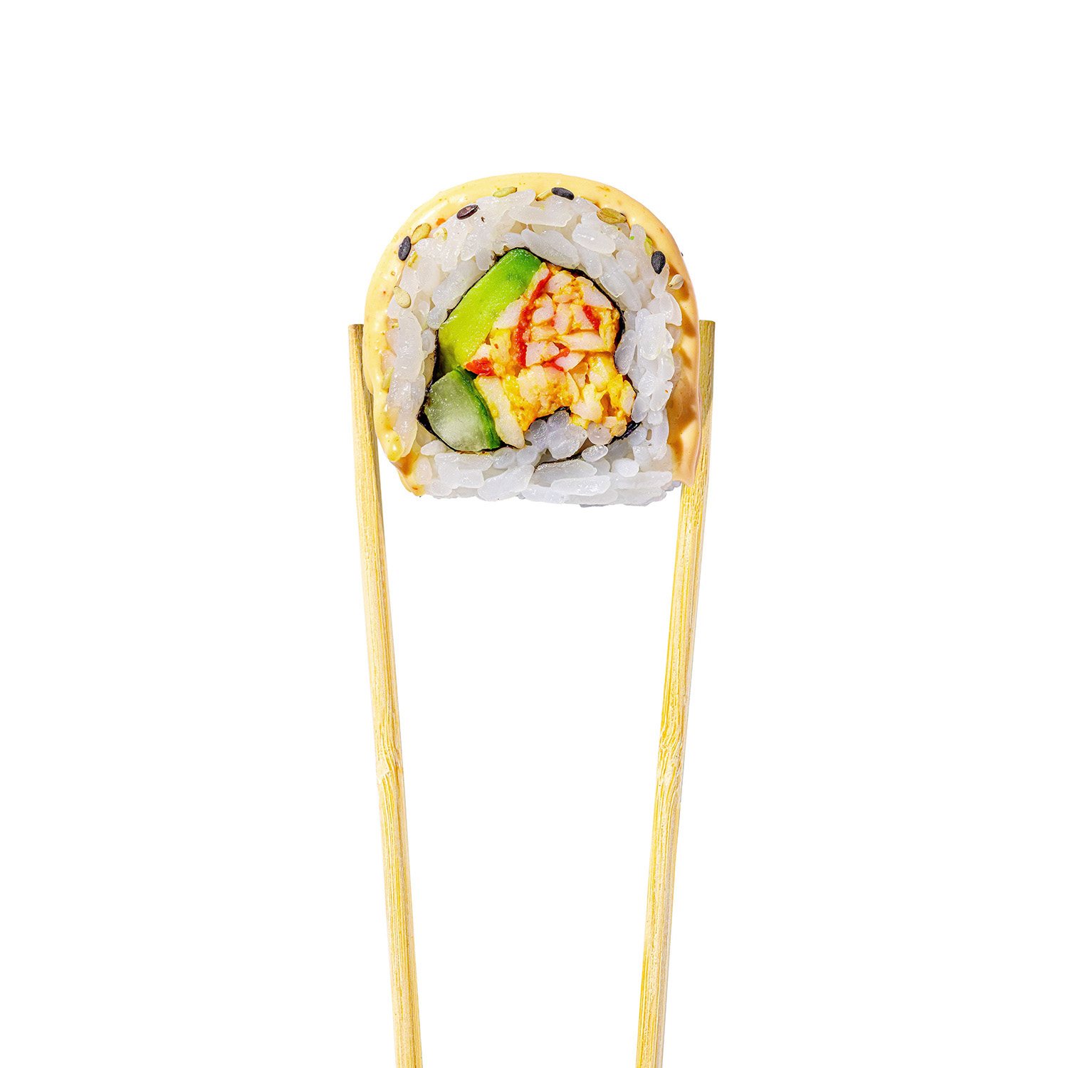 Ingredients: Cooked White Rice ( Rice, Water, Vinegar[Sugar, Rice Vinegar, Salt, Citric Acid, Water, Brown Sugar]), Imitation Crabmeat [Alaska Pollock, Water, Wheat Starch, Sugar, Potato Starch, Contain 2% Or Les Of: Canola Oil, Mirin Wine {Sake, Sugar, Salt, Water, Yeast Extract}, Salt, Natural Crab Flavor{Swimming Crab, Snow Crab}, Modified Potato Starch, Potassium Chloride, Citric Acid, Paprika Oleoresin, Lycopene, Color Added], Water, Avocado, Cucumber, Rice, Shrimp Tempura (Farm Raised Vannamei Shrimp, Soybean Oil, Unbleached Wheat Flour, Modified Starch, Salt, Safflower Oil, Starch, Baking Powder, Soybean Protein, Soybean Powder, Riboflavin, Paprika Color, Mixed Tocopherols), Soy Sauce(Water, Soybean, Wheat, Salt, Vinegar), Pickled Ginger(Ginger, Water, Salt, Sugar, Vinegar), Unagi Sauce (Rice Wine [Corn Syrup, Fermented Rice Extract {Rice, Alcohol, Salt, Citric Acid}, Water, Salt], Brown Sugar, Water, Soy Sauce [Water, Soybeans, Wheat, Salt], Modified Corn Starch, Caramel Color), Lettuce, Sugar, Water, Rice Vinegar, Salt, Citric Acid, Brown Sugar, Mayonnaise (Soybean Oil, Egg Yolk, Distilled Vinegar, Water, Egg White, Sugar, Contains 2% Or Less Of: Salt, Spice, Calcium Disodium Edta(To Protect Flavor), Ebi Shrimp (Shrimp, Salt), Wasabi (Horseradish, Mustard, Spirulina), Tempura Crunch (Tempura Crunch [Wheat Flour, Corn Starch, Rice Flour, Pea Protein, Soybean Oil, Salt, Water], Paprika Oleoresin [Oleoresin Paprika, Refined Sunflower Oil]), Fried Onions (Onions, Vegetable Oil, Wheat Flour, Salt), Seaweed, Sesame Seeds, Sriracha Sauce (Chili,Garlic, Sugar, Salt, Modified Tapioca Starch, Acetic Acid, Xanthan Gum, Ribotide, Sodium Benzoate As Preservative)