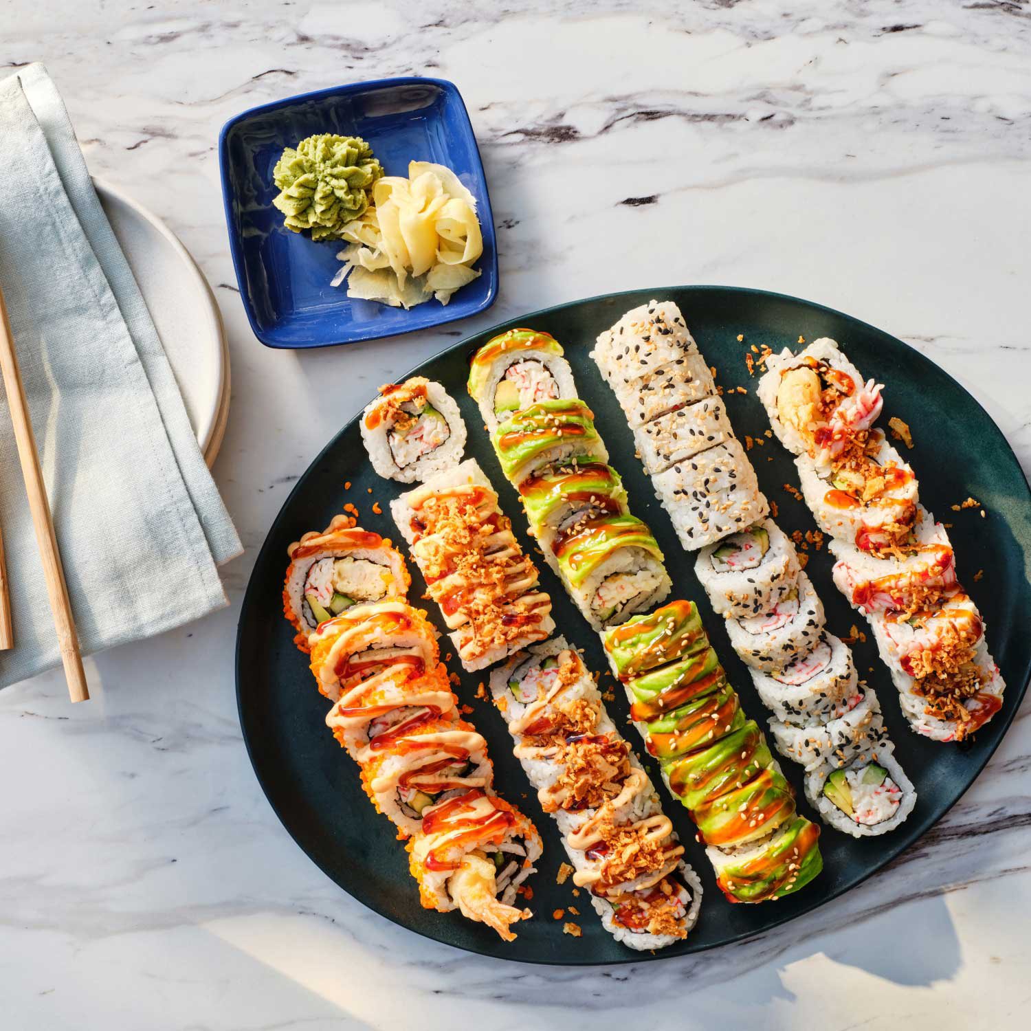- Platter includes Shrimp Nigiri, Dragon Roll, Shrimp Tempura Crunch Roll, Crunchy California Roll, and California Roll