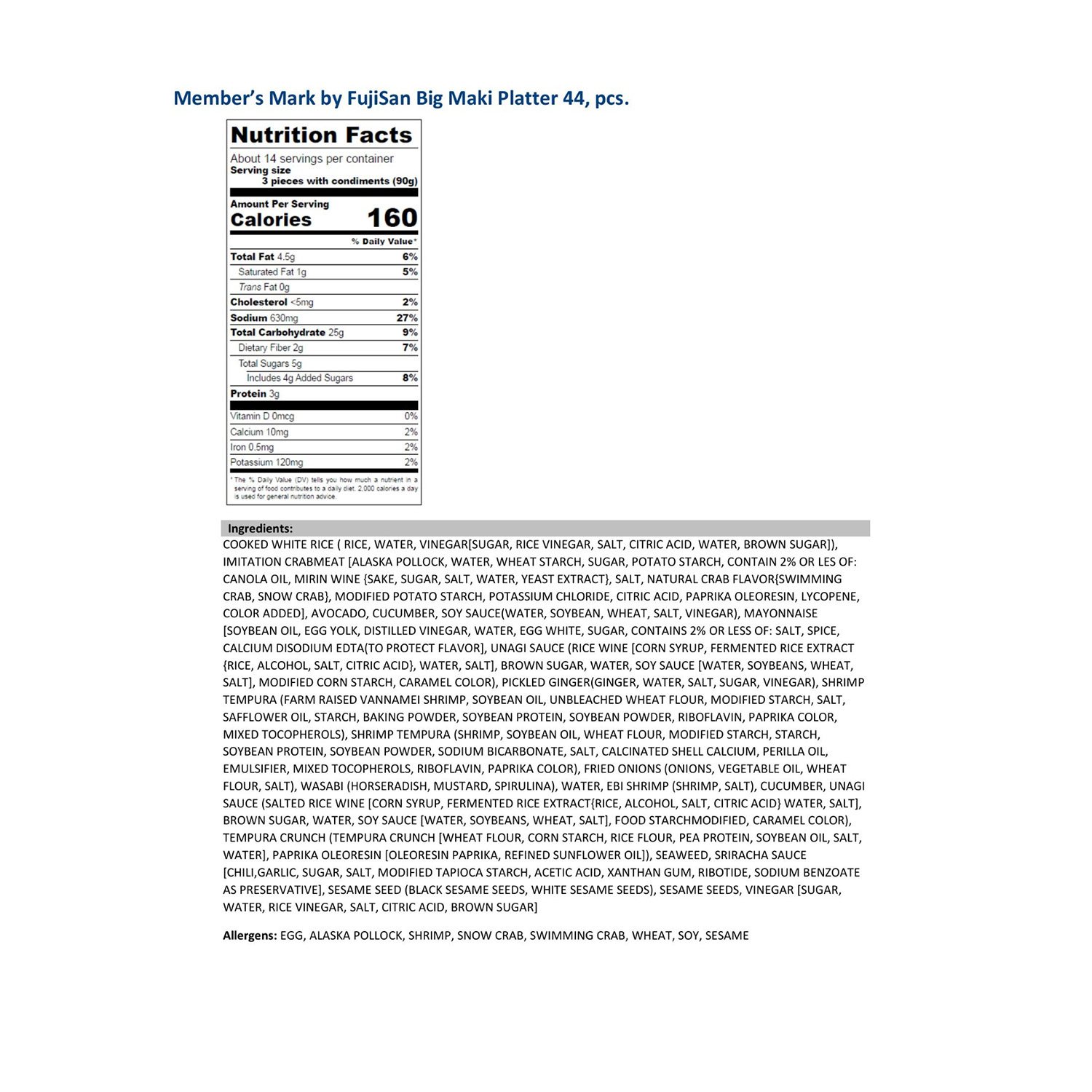 Contains: Egg, Alaska Pollock, Shrimp, Snow Crab, Swimming Crab, Wheat, Soy, Sesame