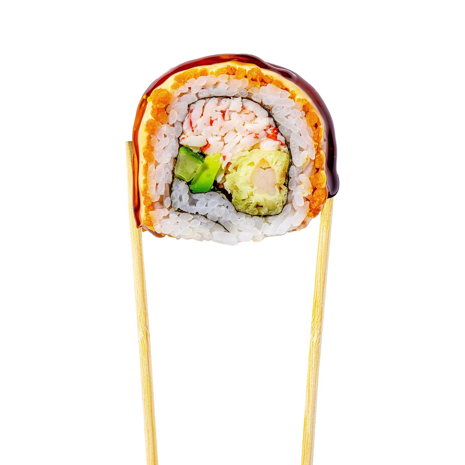 Ingredients: Cooked White Rice ( Rice, Water, Vinegar[Sugar, Rice Vinegar, Salt, Citric Acid, Water, Brown Sugar]), Imitation Crabmeat [Alaska Pollock, Water, Wheat Starch, Sugar, Potato Starch, Contain 2% Or Les Of: Canola Oil, Mirin Wine {Sake, Sugar, Salt, Water, Yeast Extract}, Salt, Natural Crab Flavor{Swimming Crab, Snow Crab}, Modified Potato Starch, Potassium Chloride, Citric Acid, Paprika Oleoresin, Lycopene, Color Added], Avocado, Cucumber, Soy Sauce(Water, Soybean, Wheat, Salt, Vinegar), Mayonnaise [Soybean Oil, Egg Yolk, Distilled Vinegar, Water, Egg White, Sugar, Contains 2% Or Less Of: Salt, Spice, Calcium Disodium Edta(To Protect Flavor], Unagi Sauce (Rice Wine [Corn Syrup, Fermented Rice Extract {Rice, Alcohol, Salt, Citric Acid}, Water, Salt], Brown Sugar, Water, Soy Sauce [Water, Soybeans, Wheat, Salt], Modified Corn Starch, Caramel Color), Pickled Ginger(Ginger, Water, Salt, Sugar, Vinegar), Shrimp Tempura (Farm Raised Vannamei Shrimp, Soybean Oil, Unbleached Wheat Flour, Modified Starch, Salt, Safflower Oil, Starch, Baking Powder, Soybean Protein, Soybean Powder, Riboflavin, Paprika Color, Mixed Tocopherols), Shrimp Tempura (Shrimp, Soybean Oil, Wheat Flour, Modified Starch, Starch, Soybean Protein, Soybean Powder, Sodium Bicarbonate, Salt, Calcinated Shell Calcium, Perilla Oil, Emulsifier, Mixed Tocopherols, Riboflavin, Paprika Color), Fried Onions (Onions, Vegetable Oil, Wheat Flour, Salt), Wasabi (Horseradish, Mustard, Spirulina), Water, Ebi Shrimp (Shrimp, Salt), Cucumber, Unagi Sauce (Salted Rice Wine [Corn Syrup, Fermented Rice Extract{Rice, Alcohol, Salt, Citric Acid} Water, Salt], Brown Sugar, Water, Soy Sauce [Water, Soybeans, Wheat, Salt], Food Starchmodified, Caramel Color), Tempura Crunch (Tempura Crunch [Wheat Flour, Corn Starch, Rice Flour, Pea Protein, Soybean Oil, Salt, Water], Paprika Oleoresin [Oleoresin Paprika, Refined Sunflower Oil]), Seaweed, Sriracha Sauce [Chili,Garlic, Sugar, Salt, Modified Tapioca Starch, Acetic Acid, Xanthan Gum, Ribotide, Sodium Benzoate As Preservative], Sesame Seed (Black Sesame Seeds, White Sesame Seeds), Sesame Seeds, Vinegar [Sugar, Water, Rice Vinegar, Salt, Citric Acid, Brown Sugar]