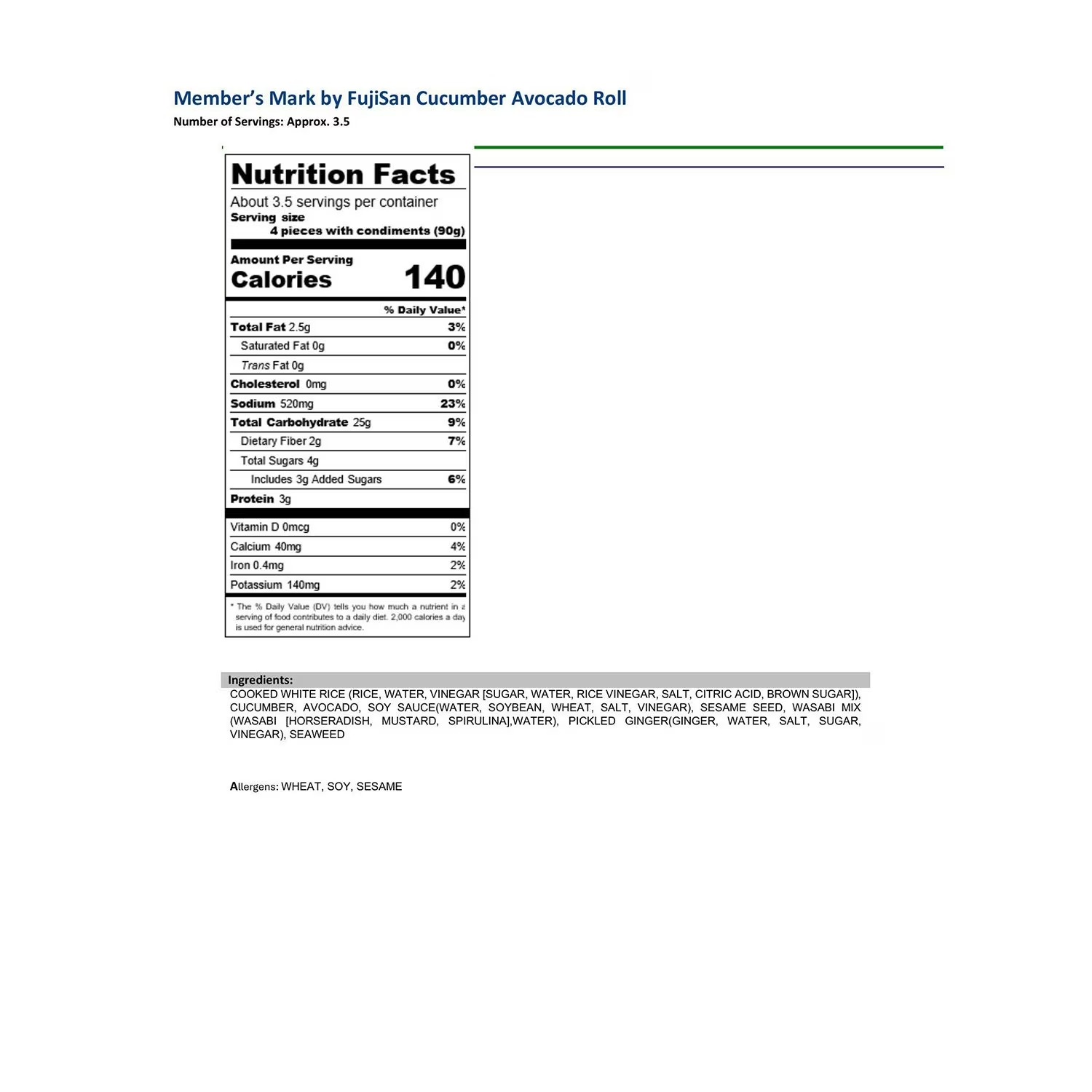 Cooked White Rice (Rice, Water, Vinegar [Sugar, Water, Rice Vinegar, Salt, Citric Acid, Brown Sugar]), Cucumber, Avocado, Soy Sauce(Water, Soybean, Wheat, Salt, Vinegar), Sesame Seed, Wasabi Mix (Wasabi [Horseradish, Mustard, Spirulina],Water), Pickled Ginger(Ginger, Water, Salt, Sugar, Vinegar), Seaweed