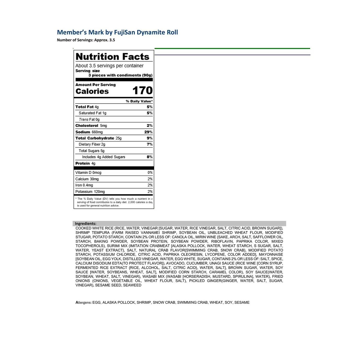 The Member's Mark by FujiSan Dynamite Roll is a flavorful combination of tempura shrimp, creamy avocado, and refreshing cucumber. Topped with imitation crab, unagi sauce, and roasted sesame seeds, this roll delivers a delightful taste experience in every bite. Perfectly crafted without raw seafood, it’s a versatile option for any outing or occasion.
