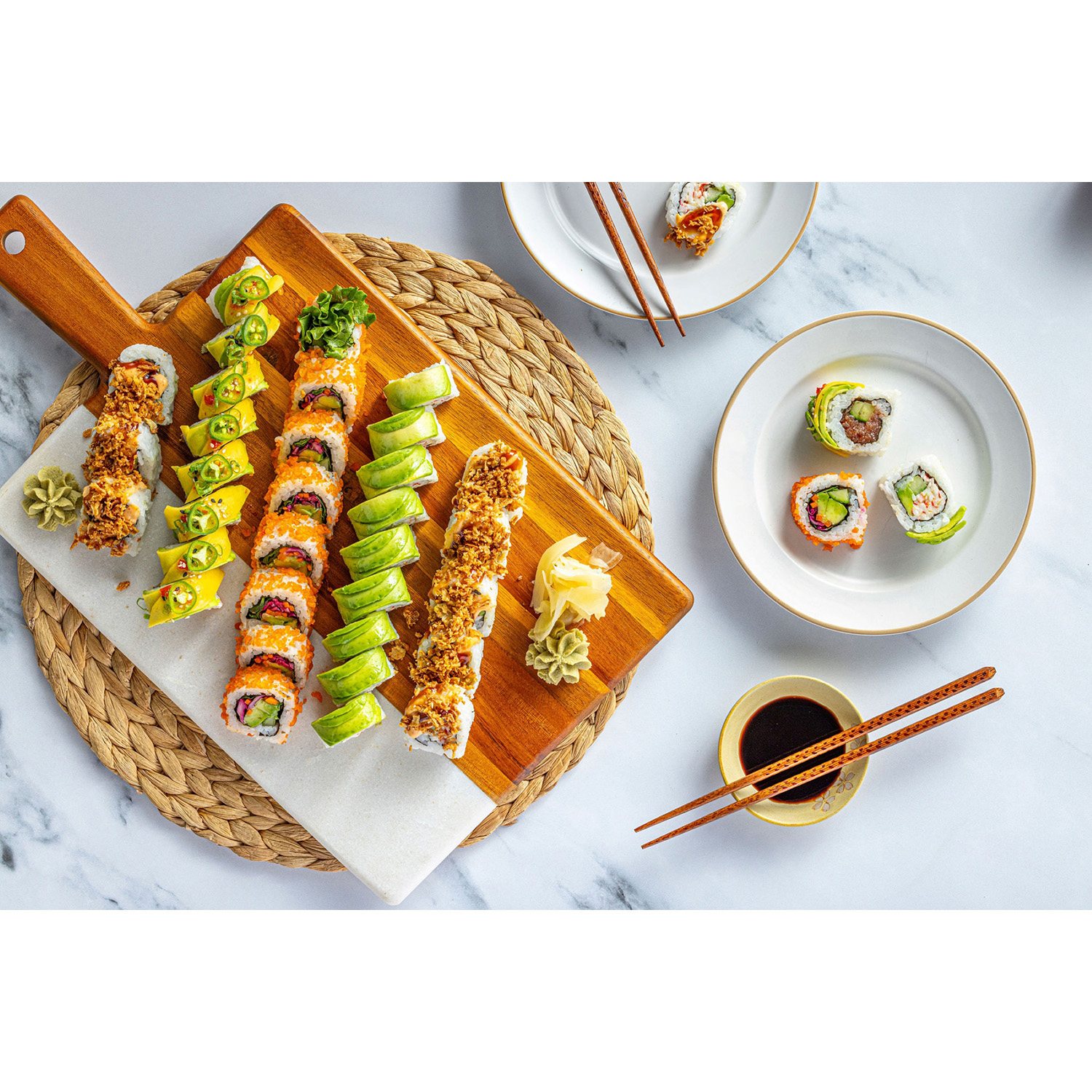 - Includes 10 pcs. each of California Crunch Roll, Veggie Roll, Spicy Mango Tuna Roll, and Green Dragon Roll