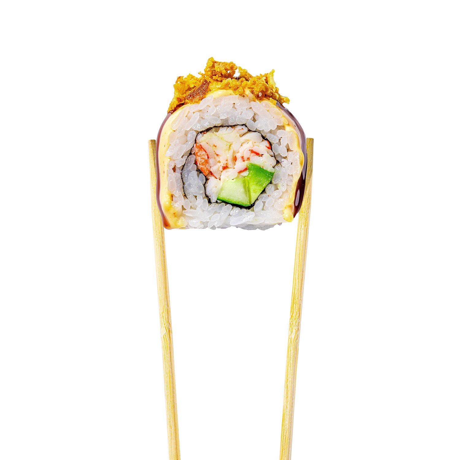 - California Crunch Roll – Creamy avocado, crisp cucumber, and imitation crab topped with spicy aioli, sweet unagi sauce, and crispy onions for a satisfying crunch.