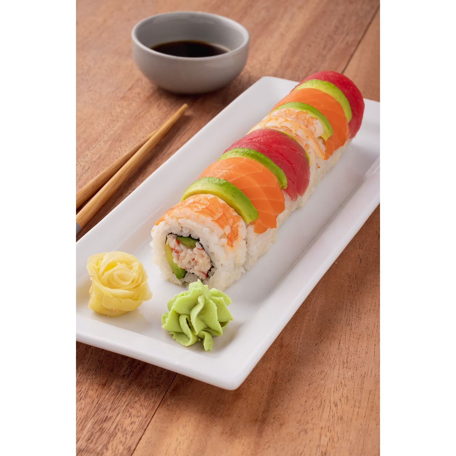 Every Rainbow Roll comes with naturally brewed soy sauce and wasabi for dipping. These traditional sushi accompaniments enhance the flavor of the roll, making each bite a culinary delight. Also included is ginger, which helps refresh your palate in between bites, allowing you to fully enjoy the distinct flavors of the sushi.