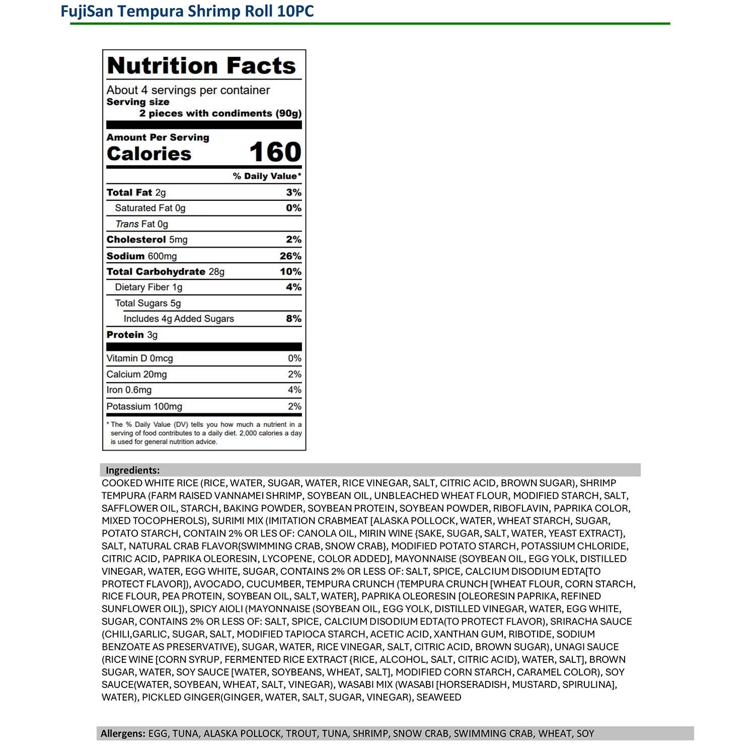 Sushi Rice (Water, Rice, Seasoned Vinegar [Sugar, Water, Rice Vinegar, Salt, Brown Sugar]), Tempura Shrimp (Shrimp, Tempura Batter [Wheat Flour, Starch, Corn Flour, Defatted Soy Bean Flour, Baking Powder {Sodium Bicarbonate}, Food Color {Riboflavin}, Modified Starch, Rice Flour, Salt, Vegetable Oil, Emulsifier], Water, Soybean Oil, Sodium Bicarbonate, Citric Acid, Sodium Citrate, Potassium Citrate, Sodium Chloride), Surimi Mix (Imitation Crabmeat [Alaska Pollock, Water, Wheat Starch, Sugar, Potato Starch, Contains 2% Or Less Of: Canola Oil, Mirin Wine {Sake, Sugar, Salt, Water, Yeast Extract}, Salt, Natural Crab Flavor {Swimming Crab, Snow Crab}, Modified Potato Starch, Potassium Chloride, Citric Acid, Paprika Oleoresin, Lycopene, Color Added], Mayonnaise [Soybean Oil, Egg Yolks, Distilled Vinegar, High Fructose Corn Syrup, Egg Whites, Water, Contains 2% Or Less Of: Salt, Spice, Calcium Disodium Edta {Protect Flavor}]), Avocado, Cucumber, Tempura Crunch (Tempura Crunch [Wheat Flour, Corn Starch, Rice Flour, Pea Protein, Soybean Oil, Salt, Water], Paprika Oleoresin [Oleoresin Paprika, Refined Sunflower Oil]), Spicy Aioli Sauce (Mayonnaise [Soybean Oil, Egg Yolks, Distilled Vinegar, High Fructose Corn Syrup, Egg Whites, Water, Contains 2% Or Less Of: Salt, Spice, Calcium Disodium Edta {Protect Flavor}], Sriracha Hot Chili Sauce [Chili, Sugar, Salt, Garlic, Distilled Vinegar, Potassium Sorbate And Sodium Bisulfite [Preservative}, Xanthan Gum, May Contain Sodium Benzoate {Preservative}], Seasoned Vinegar [Sugar, Water, Rice Vinegar, Salt, Brown Sugar]), Unagi Sauce (Rice Wine [ Corn Syrup, Fermented Rice Extract{Rice, Alcohol, Salt, Citric Acid}, Water, Salt], Brown Sugar, Water, Soy Sauce [Water, Soybeans, Wheat, Salt], Modified Corn Starch, Caramel Color), Soy Sauce (Water, Soybean, Wheat, Salt, Vinegar), Wasabi Mix (Water, Mustard, Corn Flour, Horseradish, Cellulose, Ascorbic Acid [For Color Retention], Citric Acid, Yellow 5, Blue 1), Pickled Ginger (Ginger, Water, Sorbitol, Salt, Citric Acid, Acetic Acid, Lactic Acid, Malic Acid, Aspartame, Potassium Sorbate [As Preservative], Saccharin, Fd & C Red No.40) Seaweed.