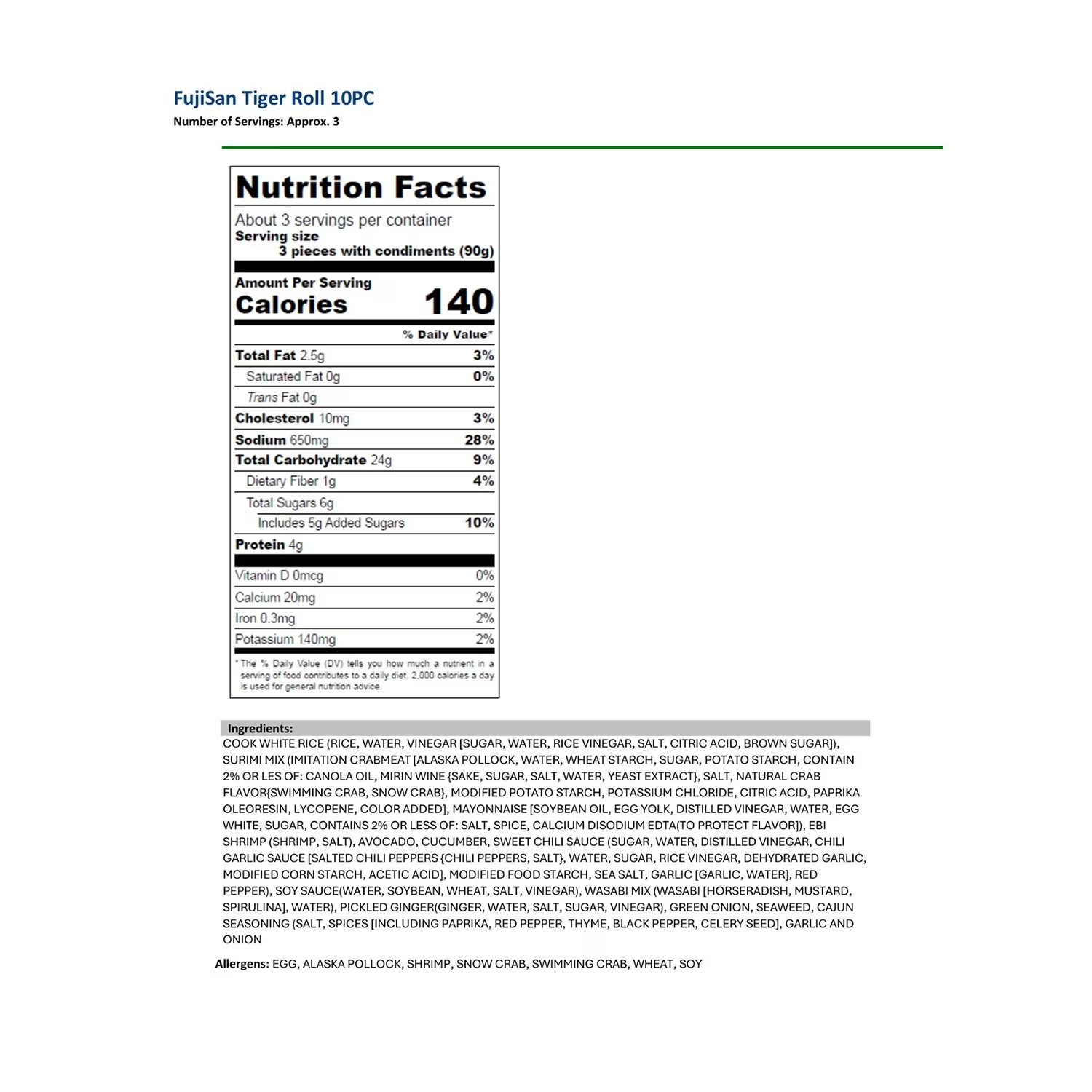 This pack includes 10 pieces of Tiger Roll, making it ideal for sharing with family and friends or enjoying as a satisfying meal. Whether you're hosting a gathering or treating yourself, this sushi roll is sure to impress.