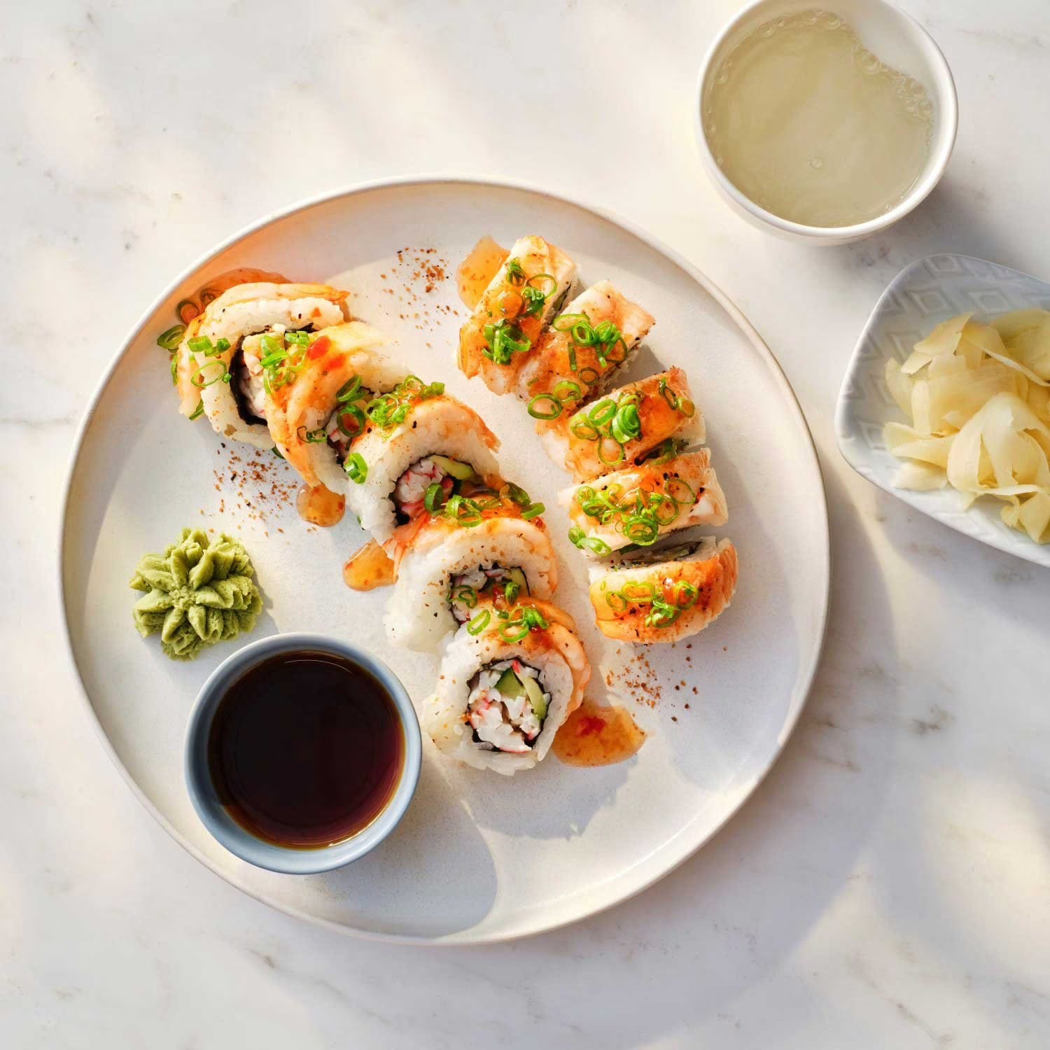 Elevate your sushi experience with the Tiger Roll's premium toppings. Cooked tiger shrimp adds a savory touch, while sweet chili sauce and cajun seasoning provide a perfect balance of sweetness and spice. Raw green scallions complete the roll with a fresh, aromatic finish. It also comes with a packet of naturally brewed soy sauce, pickled ginger, and wasabi.