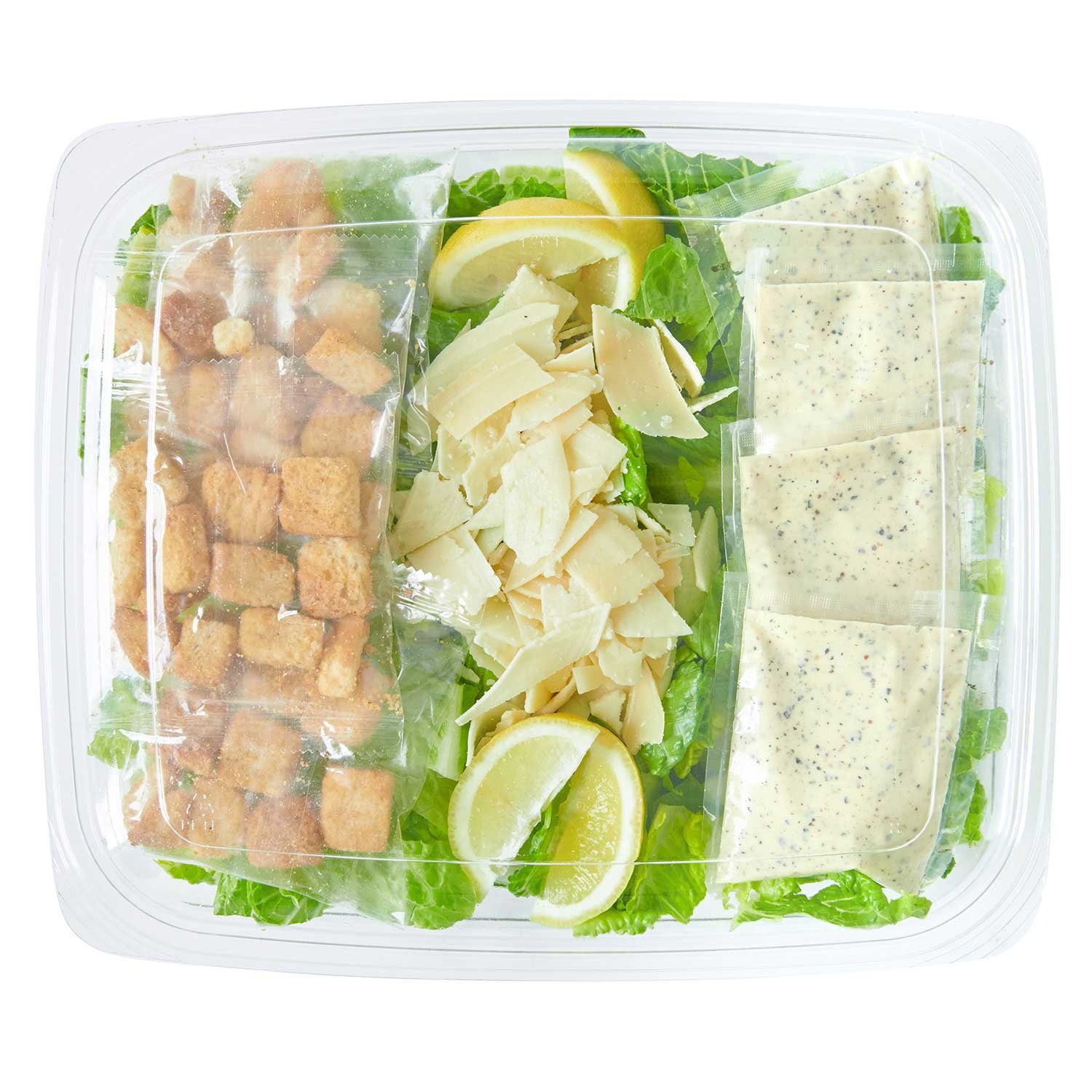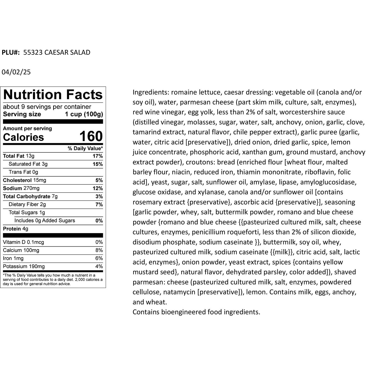 Ingredients: Romaine Lettuce, Caesar Dressing: Vegetable Oil (Canola And/Or Soy Oil), Water, Parmesan Cheese (Part Skim Milk, Culture, Salt, Enzymes), Red Wine Vinegar, Egg Yolk, Less Than 2% Of Salt, Worcestershire Sauce (Distilled Vinegar, Molasses, Sugar, Water, Salt, Anchovy, Onion, Garlic, Clove, Tamarind Extract, Natural Flavor, Chile Pepper Extract), Garlic Puree (Garlic, Water, Citric Acid [Preservative]), Dried Onion, Dried Garlic, Spice, Lemon Juice Concentrate, Phosphoric Acid, Xanthan Gum, Ground Mustard, Anchovy Extract Powder), Croutons: Bread (Enriched Flour [Wheat Flour, Malted Barley Flour, Niacin, Reduced Iron, Thiamin Mononitrate, Riboflavin, Folic Acid], Yeast, Sugar, Salt, Sunflower Oil, Amylase, Lipase, Amyloglucosidase, Glucose Oxidase, And Xylanase, Canola And/Or Sunflower Oil [Contains Rosemary Extract {Preservative}, Ascorbic Acid {Preservative}], Seasoning [Garlic Powder, Whey, Salt, Buttermilk Powder, Romano And Blue Cheese Powder {Romano And Blue Cheese {{Pasteurized Cultured Milk, Salt, Cheese Cultures, Enzymes, Penicillium Roqueforti, Less Than 2% Of Silicon Dioxide, Disodium Phosphate, Sodium Caseinate }}, Buttermilk, Soy Oil, Whey, Pasteurized Cultured Milk, Sodium Caseinate {{Milk}}, Citric Acid, Salt, Lactic Acid, Enzymes}, Onion Powder, Yeast Extract, Spices {Contains Yellow Mustard Seed}, Natural Flavor, Dehydrated Parsley, Color Added]), Shaved Parmesan: Cheese (Pasteurized Cultured Milk, Salt, Enzymes, Powdered Cellulose, Natamycin [Preservative]), Lemon.