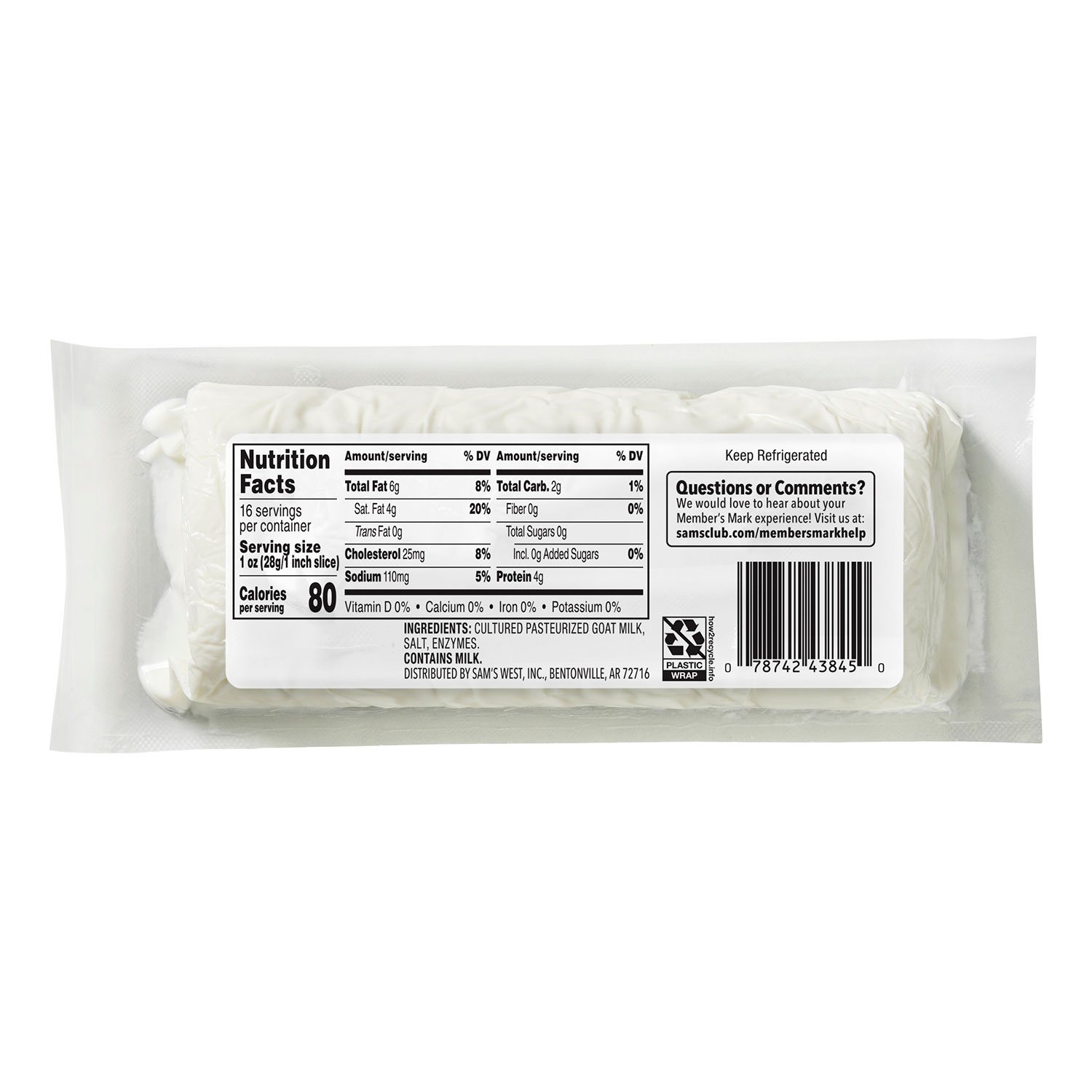 Member's Mark Fresh Goat Cheese Log is made with American goat milk. It has a soft yet crumbly texture, and a mild, tangy taste. Goat cheese is rich in protein along with a powerful combination of calcium, phosphorus and copper that is essential for bone health.