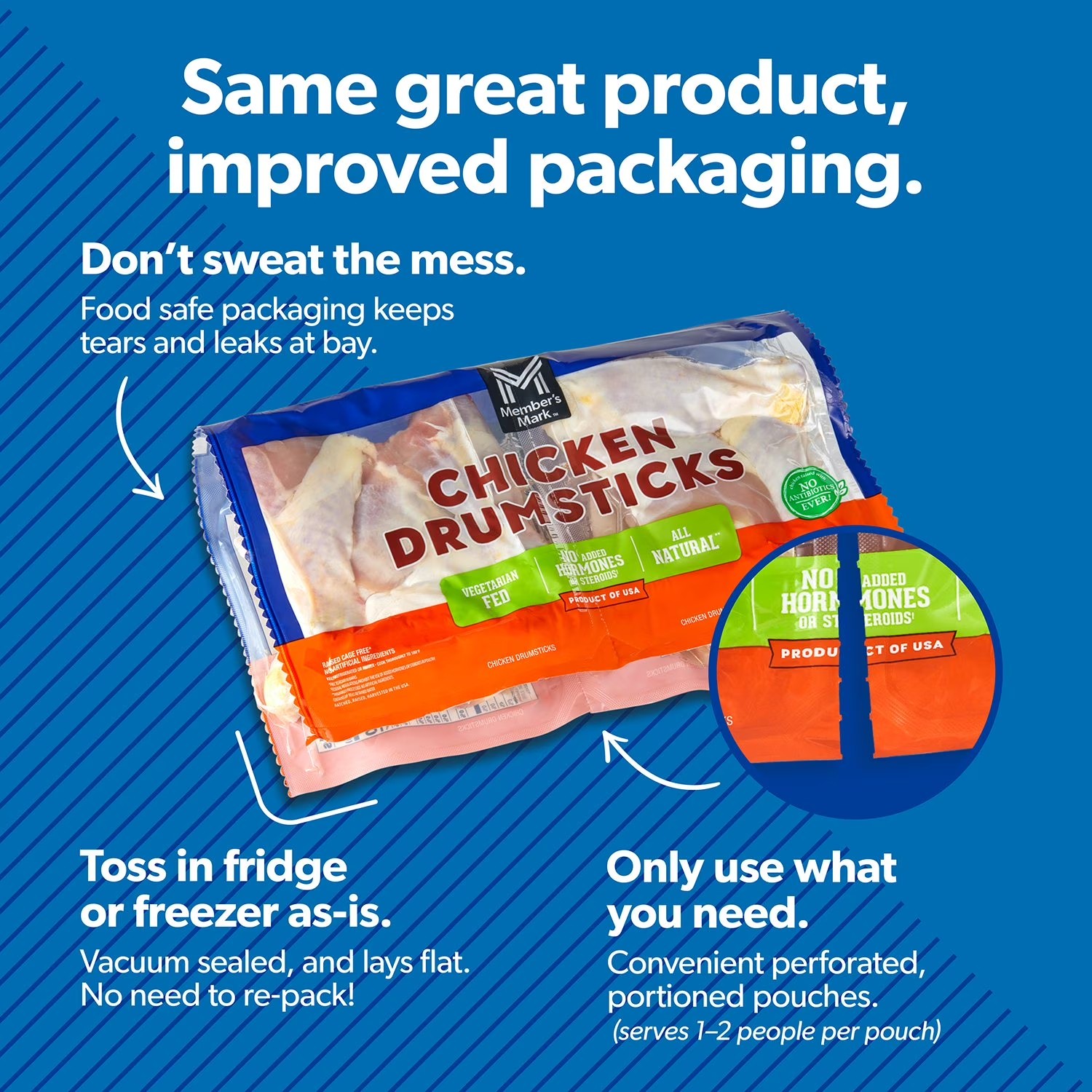 With Member’s Mark™ Fresh Chicken Drumsticks, everyone gets a drumstick! Baked, grilled, or air-fried, delicious, all-natural drumsticks are not only nutritious with 20 grams of protein per 4 oz serving, but they’re fun to eat. Kids, both big and small, love that chicken drumsticks have natural, built-in “handles.” Serve with corn on the cob and buttermilk biscuits, and there’s no silverware required at the dinner table! Conveniently packaged for 1-2 servings per perforated pouch (feeds 1-2 people), Member’s Mark™ Chicken Drumsticks offer flexibility to use only what you want and freeze or refrigerate the rest. Proudly raised and processed in the U.S.A. from chickens raised by family farmers who care, with nothing added except farmer know-how. Give them a try and taste the difference of real, quality chicken!