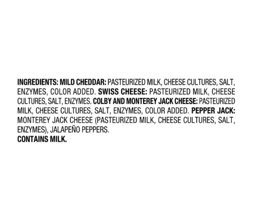This variety pack of cracker cut cheese includes mild cheddar, swiss, colby jack and pepper jack cheese in each pack. Create an elaborate charcuterie board by combining this cheese selection with crackers, artisan breads, fresh fruits, dried fruits, nuts, cured meats, dips and jellies. For a more simple snack, enjoy the cheeses with your favorite tea or wine.