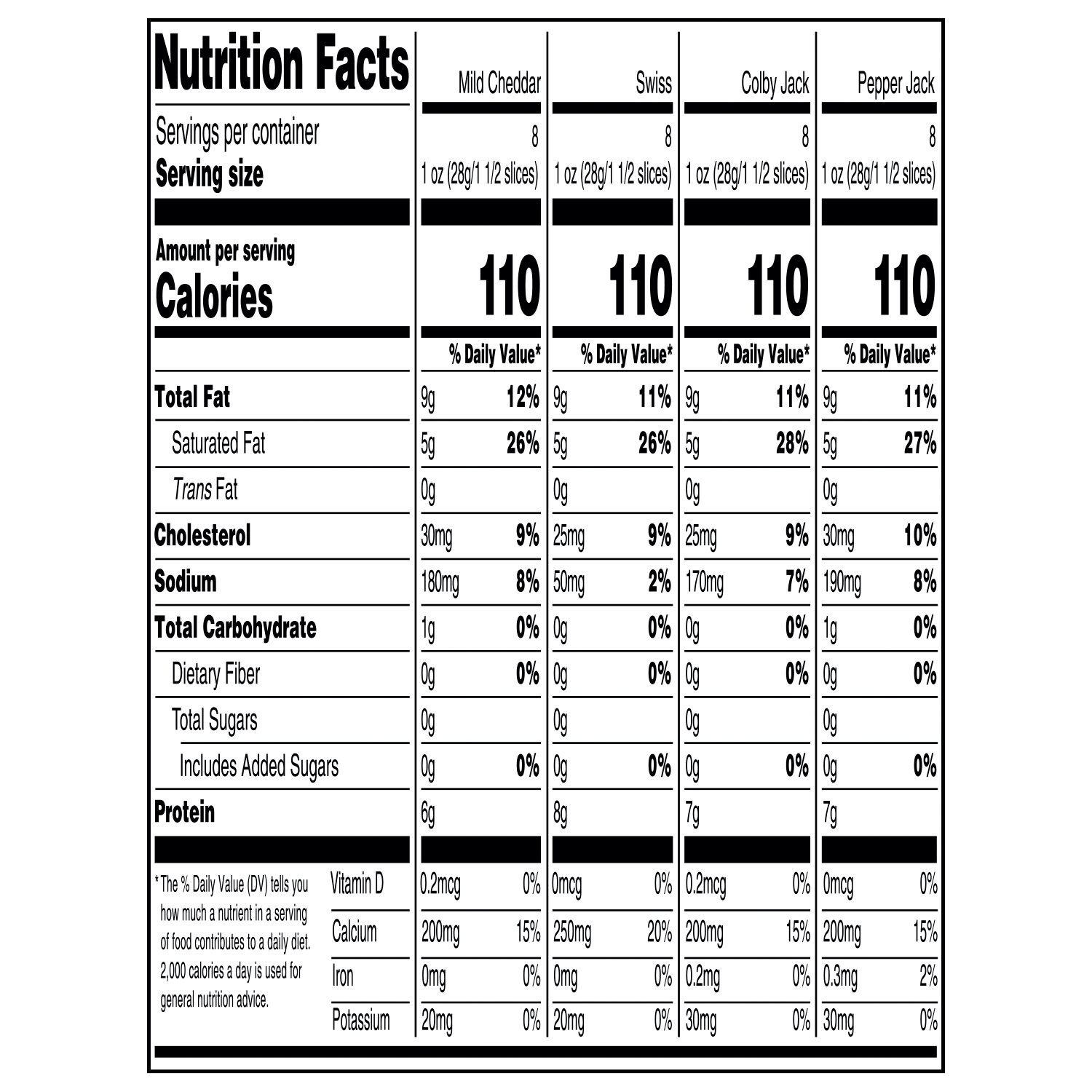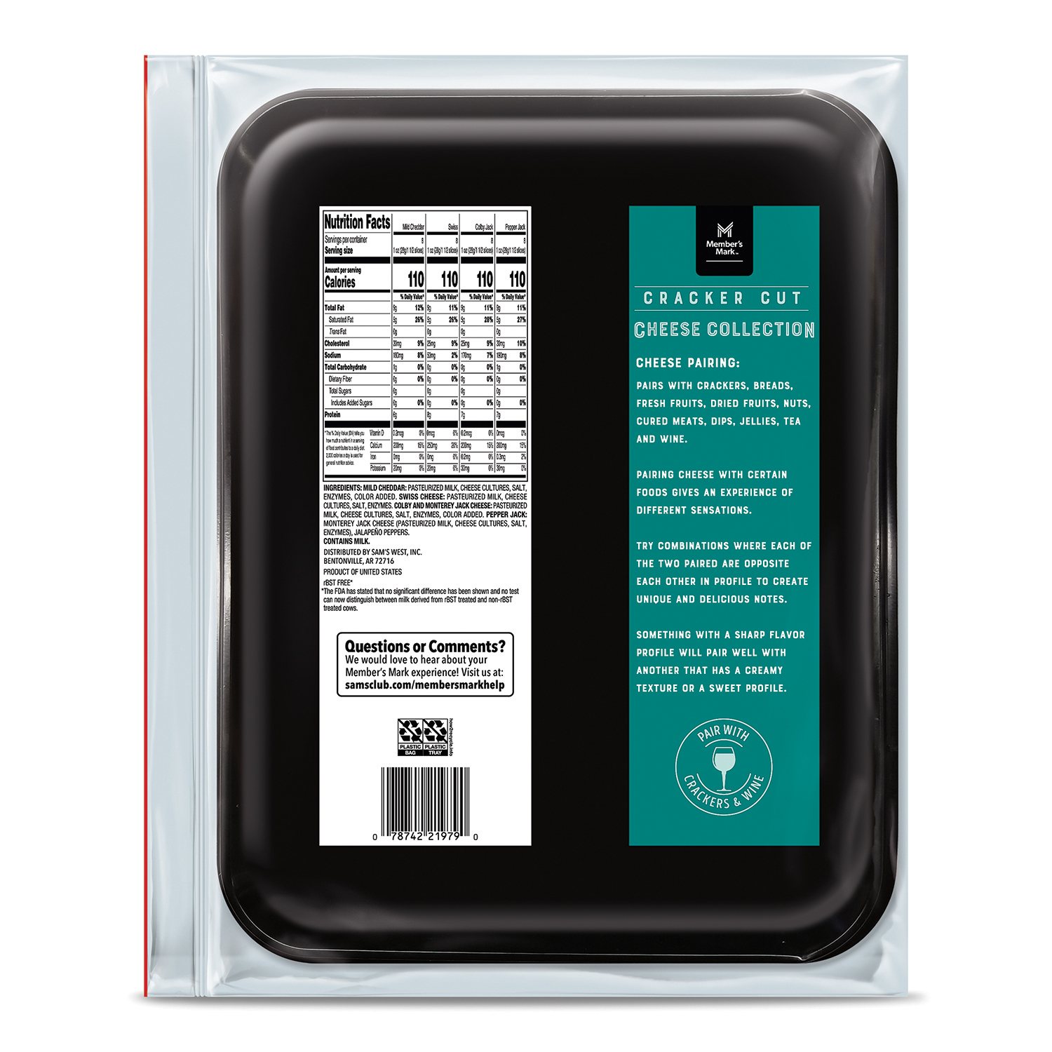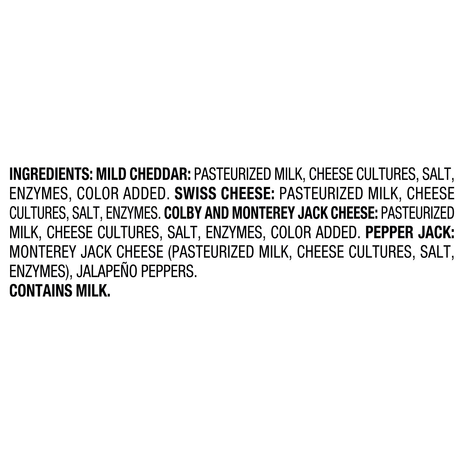 - Includes mild cheddar, swiss, colby jack and pepper jack cheese