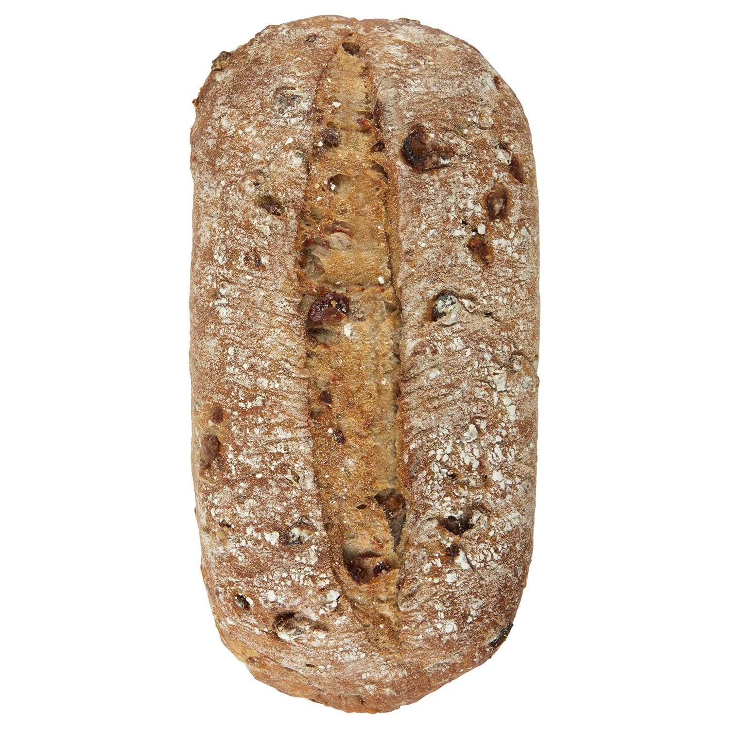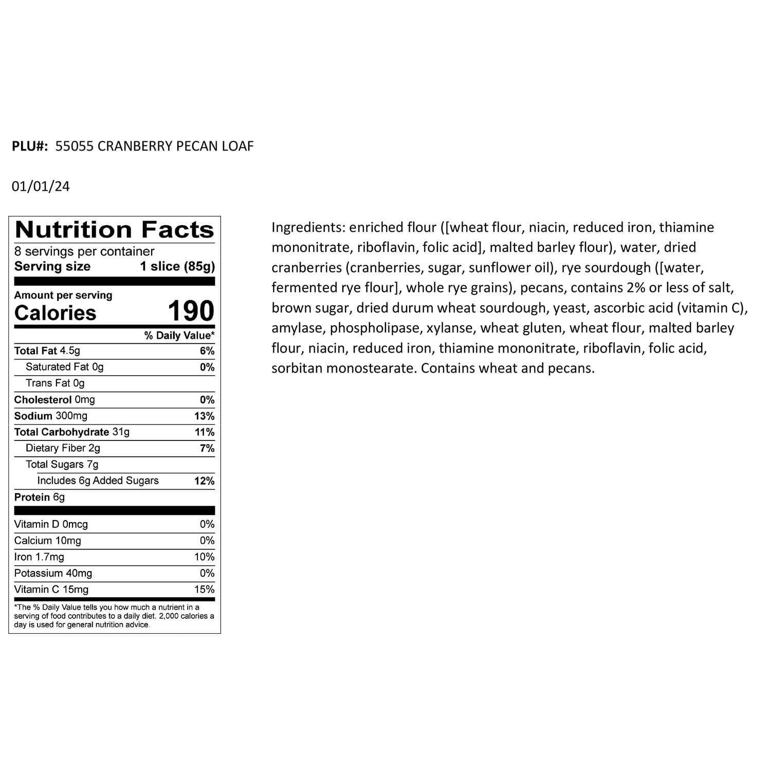 Ingredients: Enriched Flour ([Wheat Flour, Niacin, Reduced Iron, Thiamine Mononitrate, Riboflavin, Folic Acid], Malted Barley Flour), Water, Dried Cranberries (Cranberries, Sugar, Sunflower Oil), Rye Sourdough ([Water, Fermented Rye Flour], Whole Rye Grains), Pecans, Contains 2% or Less of Salt, Brown Sugar, Dried Durum Wheat Sourdough, Yeast, Ascorbic Acid (Vitamin C), Amylase, Phospholipase, Xylanase, Wheat Gluten, Wheat Flour, Malted Barley Flour, Niacin, Reduced Iron, Thiamine Mononitrate, Riboflavin, Folic Acid, Sorbitan Monostearate.