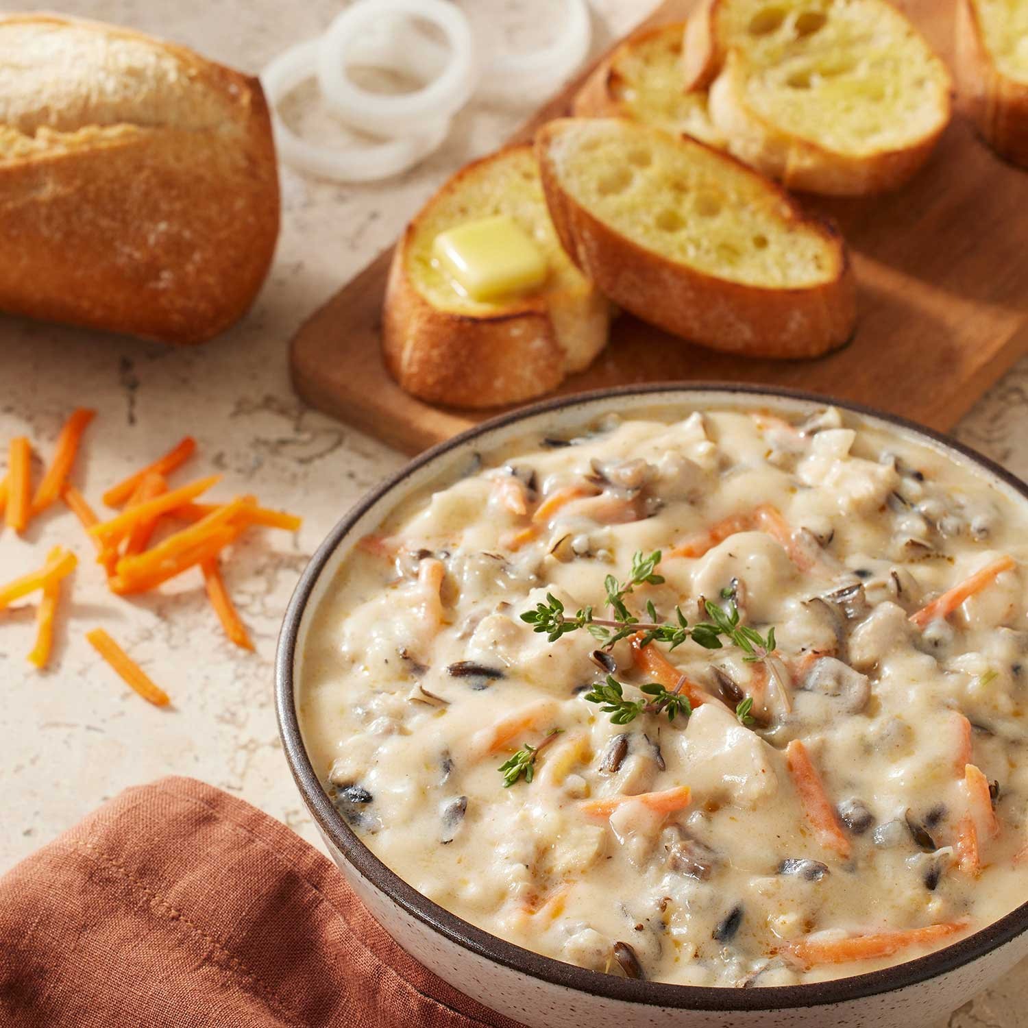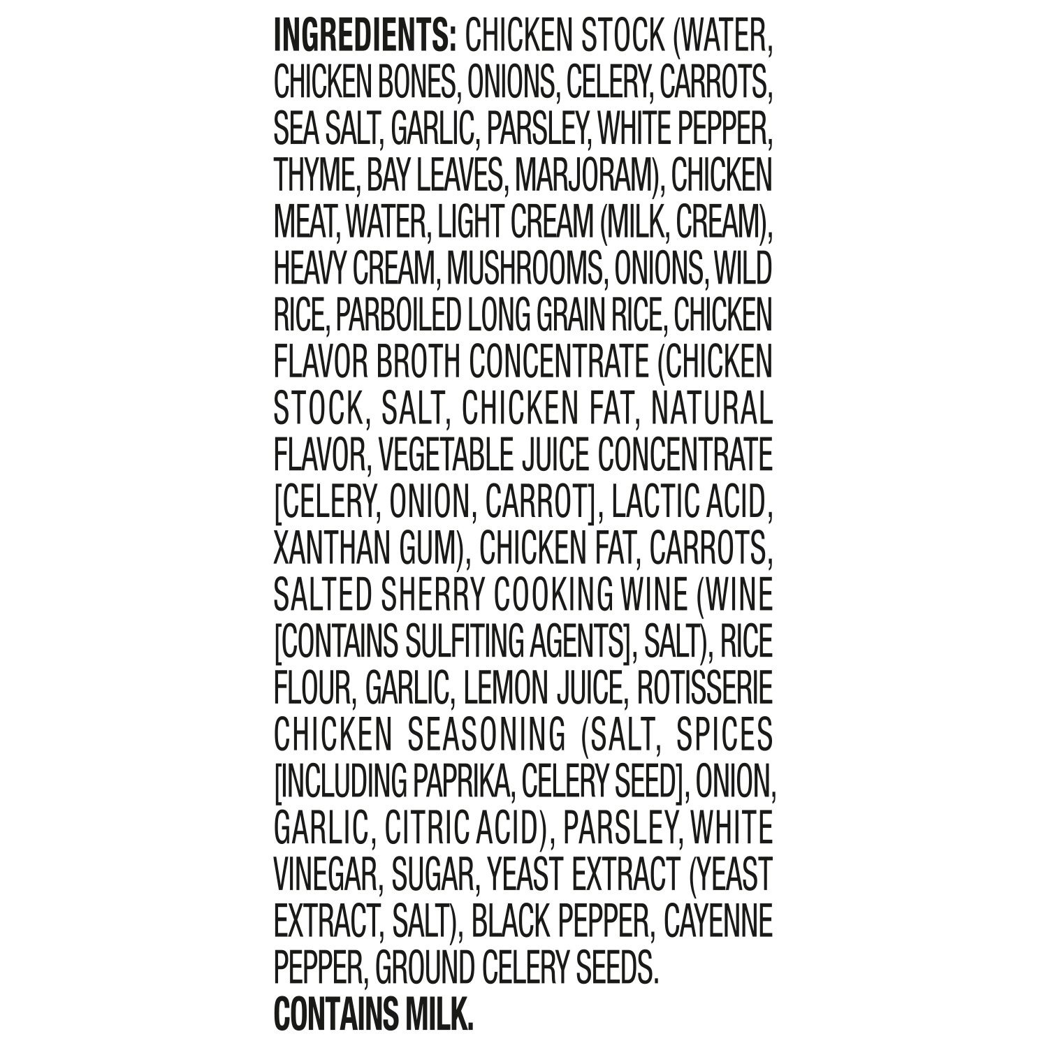 Chicken Stock (Water, Chicken Bones, Onions, Celery, Carrots, Sea Salt, Garlic, Parsley, White Pepper, Thyme, Bay Leaves, Marjoram), Chicken Meat, Water, Light Cream (Milk, Cream), Heavy Cream, Mushrooms, Onion, Wild Rice, Parboiled Long Grain Rice, Chicken Flavor Broth Concentrate (Chicken Stock, Salt, Chicken Fat, Natural Flavor, Vegetable Juice Concentrate [Celery, Onion, Carrot], Lactic Acid, Xanthan Gum), Chicken Fat, Carrots, Salted Sherry Cooking Wine (Wine [Contains Sulfiting Agents], Salt), Rice Flour, Garlic, Lemon Juice, Rotisserie Chicken Seasoning (Salt, Spices [Including Paprika, Celery Seed], Onion, Garlic, Citric Acid), Parsley, White Vinegar, Sugar, Yeast Extract (Yeast Extract, Salt), Black Pepper, Cayenne Pepper, Ground Celery Seeds.