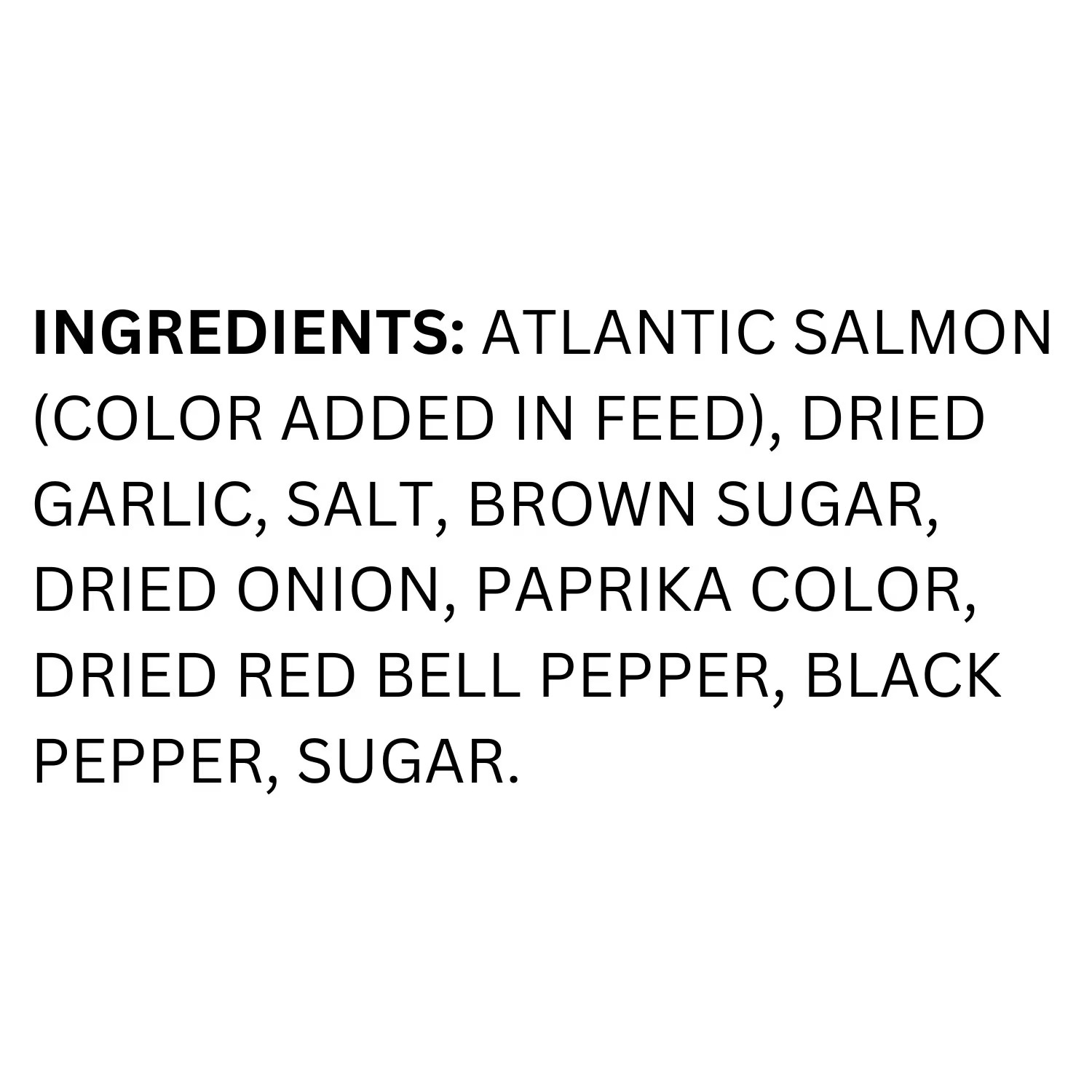 Ingredients: Atlantic Salmon (Color Added In Feed), Dried Garlic, Salt, Brown Sugar, Dried Onion, Paprika Color, Dried Red Bell Pepper, Black Pepper, Sugar.