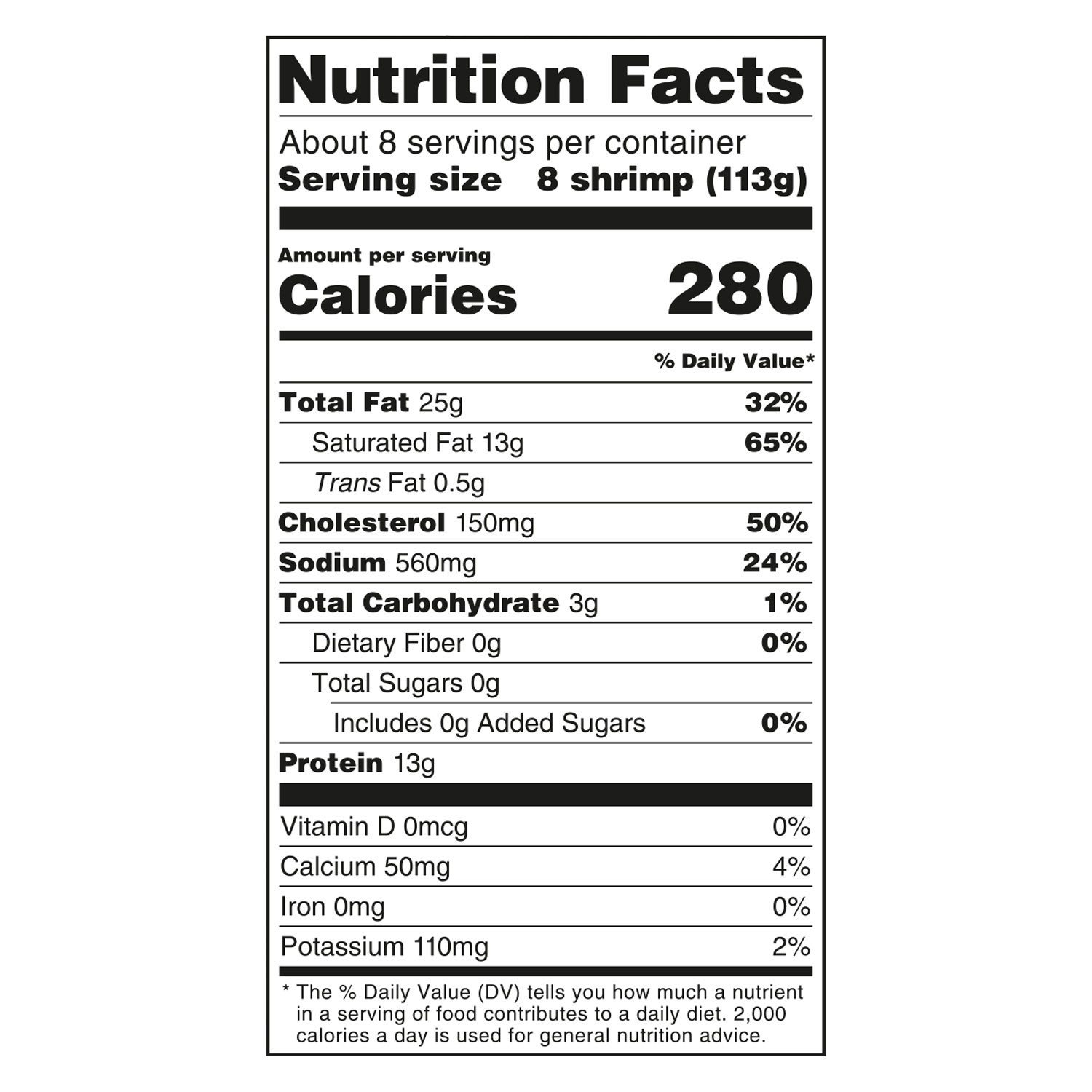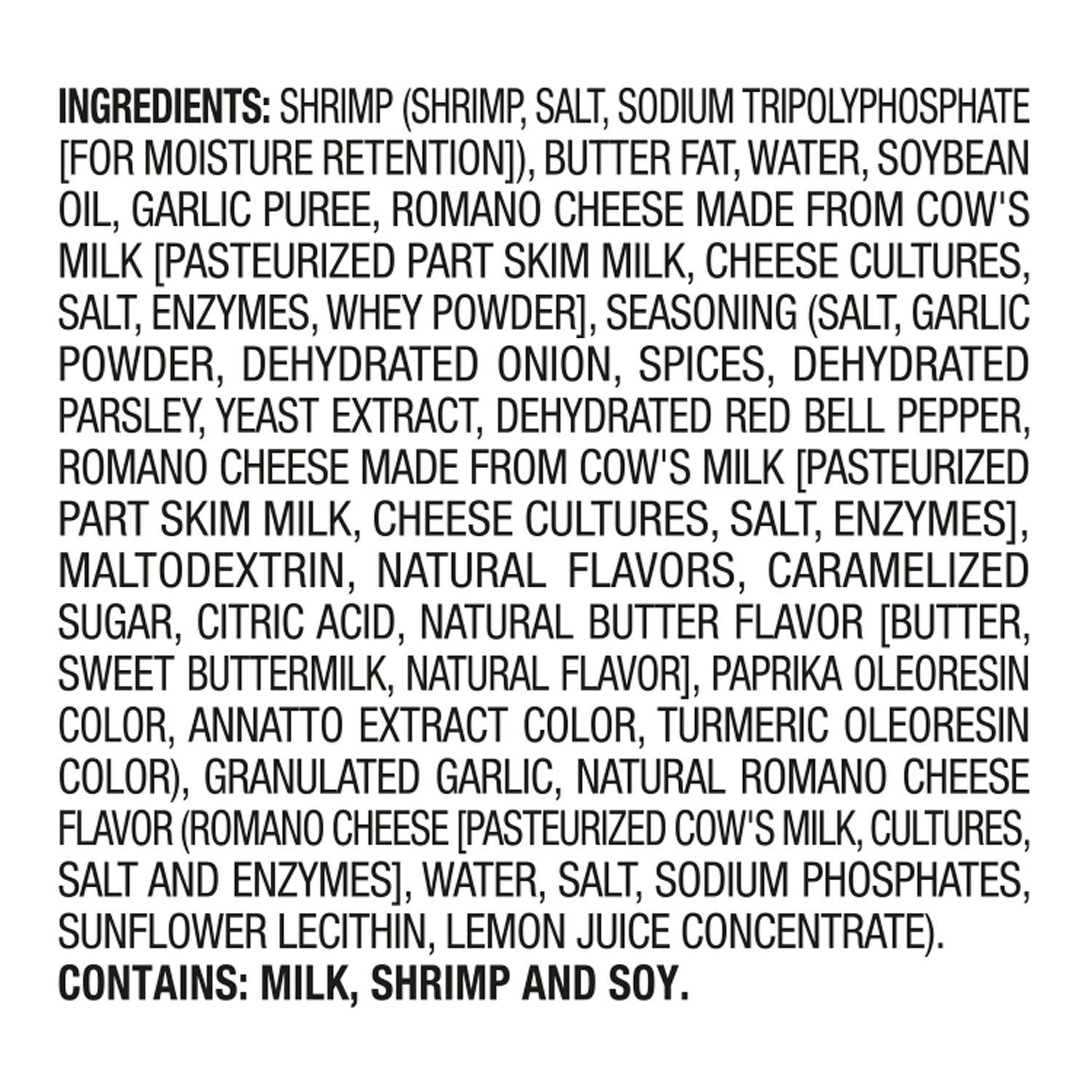 Ingredients: Shrimp (Shrimp, Salt, Sodium Tripolyphosphate [for Moisture Retention]), Butter Fat, Water, Soybean Oil, Garlic Puree, Romano Cheese Made From Cow's Milk [pasteurized Part Skim Milk, Cheese Cultures, Salt, Enzymes, Whey Powder], Seasoning (Salt, Garlic Powder, Dehydrated Onion, Spices, Dehydrated Parsley, Yeast, Extract, Dehydrated Red Bell Pepper, Romano Cheese Made From Cow's Milk [pasteurized Part Skim Milk, Cheese Cultures, Salt, Enzymes], Maltodextrin, Natural Flavors, Caramelized Sugar, Citric Acid, Natural Butter Flavor [butter, Sweet Buttermilk, Natural Flavor], Paprika Oleoresin Color, Annatto Extract Color, Turmeric Oleoresin Color), Granulated Garlic, Natural Romano Cheese Flavor (Romano Cheese [pasteurized Cow's Milk, Cultures, Salt, Enzymes], Water, Salt, Sodium Phosphates, Sunflower Lecithin, Lemon Juice Concentrate).