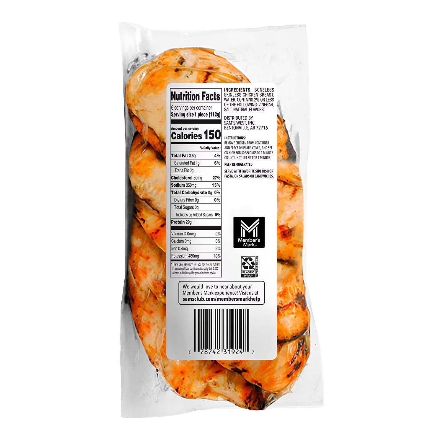 Member's Mark Grilled Chicken Breasts are grilled over an open flame and fully cooked to perfection. These tender, moist breasts are 100% natural and ready to complement any sides you whip up. Fresh, never frozen, taste the difference in your dishes when using meat that's healthier and higher quality.